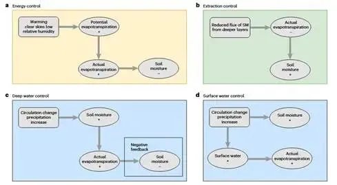 构建全球生长季为前期条件缓慢演变与关键季节土壤湿度累积趋势的框架,以时空变化蒸发控制表达地表水分平衡,区分土壤湿度稳健下降区与不确定区。识别北美西部、欧洲、南美和南部非洲为干旱新兴热点(近期观测干燥与预测机制一致),区别于观测与预测不一致地区(如东非和南美洲南部),基于过程的方法阐明机制驱动因素并稳健识别热带温带干旱热点。