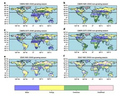 三种状态对变暖响应各异(图3):能量控制状态下变暖与土壤湿度下降关系最明确;水分控制状态下温度效应受降水变率调节而不确定;提取控制状态下取决于相对湿度趋势——湿度维持则变暖加剧蒸腾耗水,湿度下降则气孔关闭抑制蒸腾。图3显示热带生长季提取控制区集中于沿海(湿度维持,变暖耗水),而北半球温带生长季及热带非生长季提取控制区湿度预计大幅下降,反而削弱干燥。高温超过作物最适温度时该效应进一步加剧。