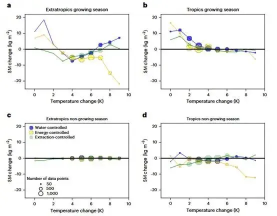 图3. 季节性累积土壤湿度变化与变暖的关系