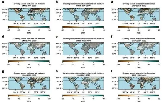 尽管预期人为气候变化下全球降水将增加,但在许多地区,土壤水分预计将下降,形成新的农业干旱热点。第六阶段耦合模式比较计划集合的全球分析表明,即使在年降水预计增加的地区,土壤水分减少也被预测出来,且与气候变化相关的信号将在2060年前可被检测。土壤水分反映局地陆面水分平衡,因此受到降水、径流和蒸发的气候驱动因素(太阳辐射、温度、湿度和风速)以及陆面和植被过程的影响。因此,变率受到陆面状况和区域气候趋势的调节,这些因素影响着蒸散发、降水截获和陆-气耦合。在长期时间尺度上,变暖增加了大气水分需求,导致蒸散发速率增加和目前水分充足地区的土壤水分下降。在年代际到百年时间尺度上,蒸发通量受到植被对二氧化碳增加和变暖响应的影响,受到冬季积雪变化的影响,以及土地利用变化的影响。这些水文气候相互作用的复杂性给厘清驱动区域土壤水分趋势的因素带来了挑战。此外,尽管农业干旱与土壤水分亏缺相关,但两者并不等同。由于大多数作物并非全年生长,有影响的农业干旱应定义为局地生长季期间的根区土壤水分亏缺——即一年生作物生长最好的季节。尽管关于陆面水分平衡已有大量研究,但农业干旱作为季节性现象的概念,受到生长季气象异常和前期条件的影响,受到的关注有限——以往大多数研究调查的是月尺度或年尺度的土壤水分下降。然而,土壤水分异常具有时间持续性,这意味着季节性干旱风险受到生长季开始时土壤水分水平和陆面水分平衡的长期变化,以及生长季期间降水、蒸发和径流变率的影响。