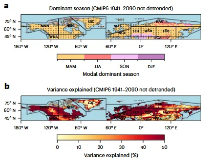 北半球温带地区(图5a-b):3-5月(MAM)为主导季节,其累积土壤湿度与生长季土壤湿度相关性最强,解释方差比例大且模式与ERA5一致。主导季节不随时间序列长度或去趋势处理而改变,证实前期条件影响源于季节性土壤湿度记忆而非长期趋势。