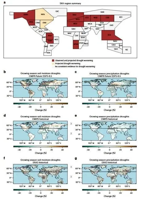 热带地区:非洲之角历史降水干旱减少致农业干旱增加,但未来降水大幅增加将缓解干旱,观测增加不可作为未来变化指标。南美洲南部近期干旱频率增加未来不会持续。非洲西南部观测与预测均显示降水减少,CMIP6一致性强,近期“归零日干旱”已归因于气候变化,为新兴干旱热点。