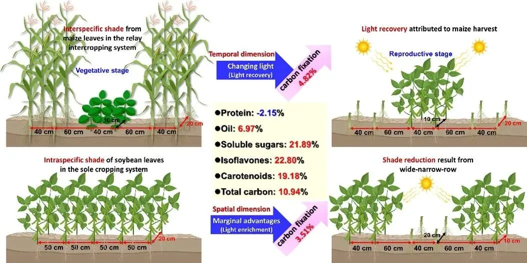 人工模拟时空荫蔽试验进一步证实,大豆冠层光环境的时空动态变化是驱动籽粒营养品质提升的关键。时间维度上,大豆营养生长期受玉米遮荫导致冠层有效光合辐射降低;玉米收获后(大豆生殖生长期),有效光合辐射显著升高,这种“光恢复”使大豆籽粒固碳提升4.82%。空间维度上,大豆与玉米的带间距≥60cm有效减轻玉米遮荫影响,削弱大豆边行劣势;玉米收获后,宽窄行配置提升大豆冠层中下部光环境、缓解其种内遮荫,提升边际优势,这种“光富集”使籽粒固碳提升3.51%。