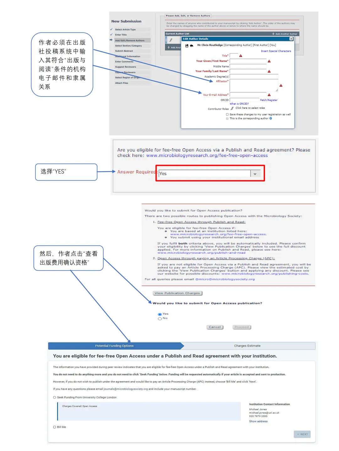 作者投稿时,需准确填写机构识别码ROR ID(https://ror.org/search),系统将会自动识别相应机构,并在 “Author Fees & OA Options” 中选择“机构保障 OA”。