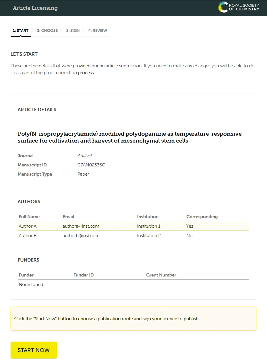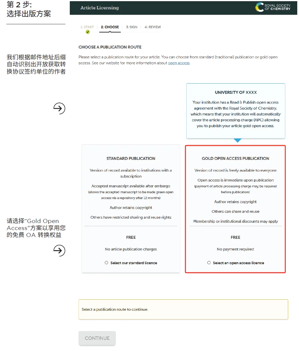 RSC根据邮件地址后缀自动识别出开放获取转换协议签约单位的作者,请选择“Gold Open Access Publication”方案以享用免费的 OA 转换权益。(注:如果选择 STANDARD PUBLICATION(标准出版)方案,不会影响论文的发表,但代表此次放弃享用免费的 OA Voucher。)