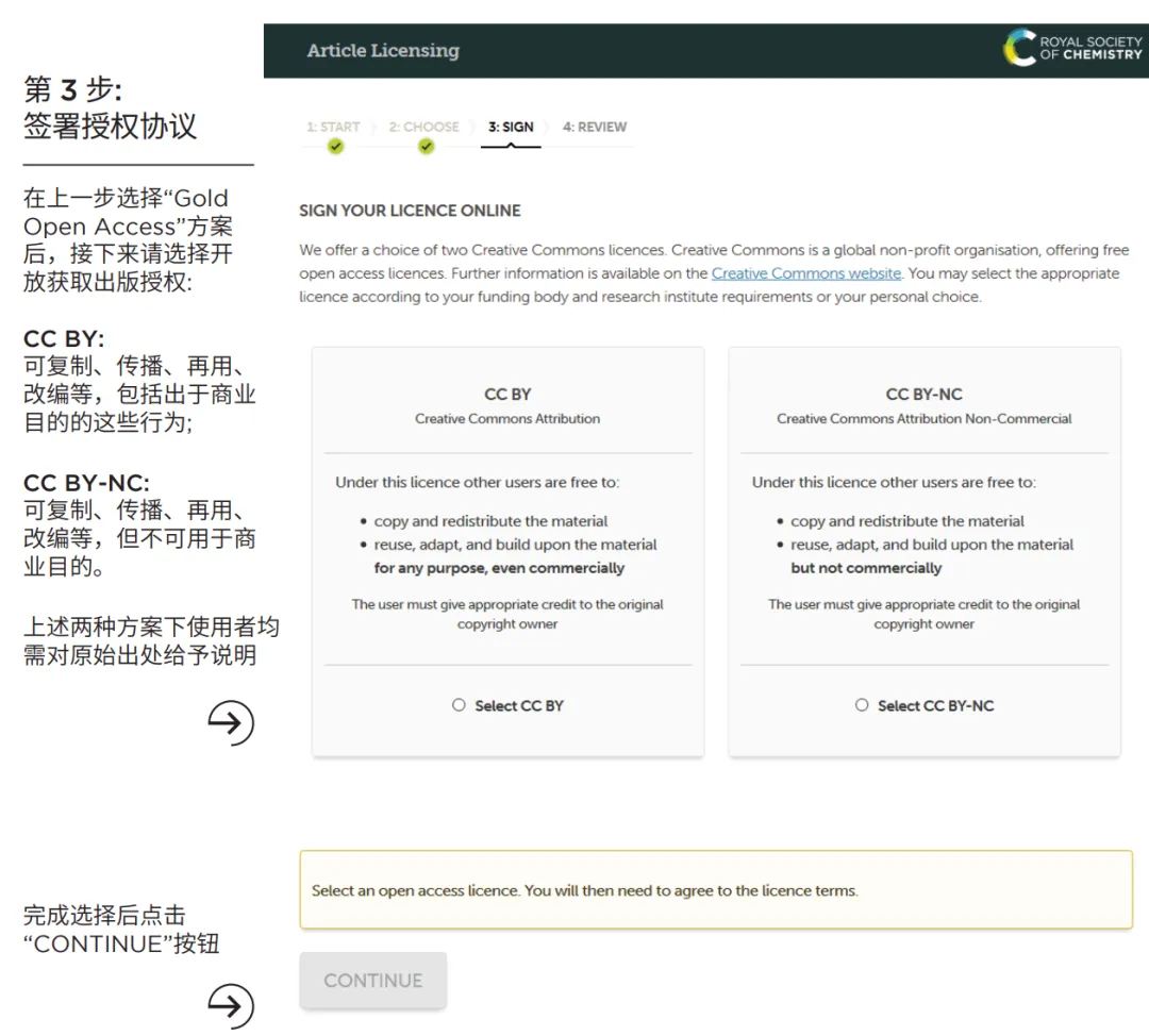 注:上述两种方案下使用者均需对原始出处给予说明,完成选择后点击“CONTINUE”按钮