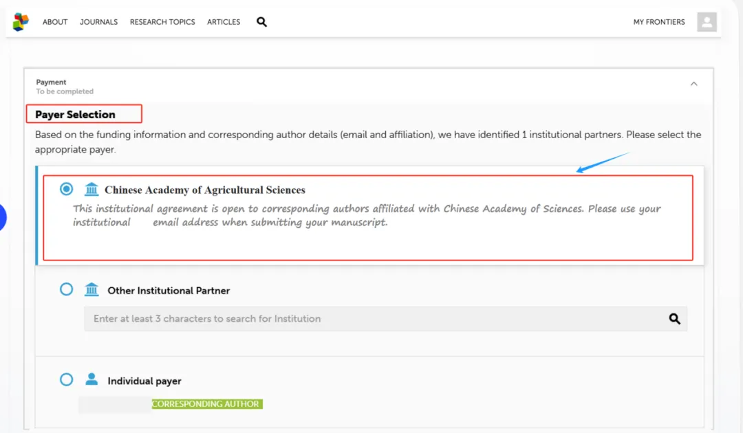 作者在Frontiers投稿系统内填写付款信息时,在Payer Selection部分勾选“Chinese Academy of Agricultural Sciences”获取APC折扣。显示的合作机构基于您之前输入的资金信息和通讯作者详细信息(机构邮箱)。