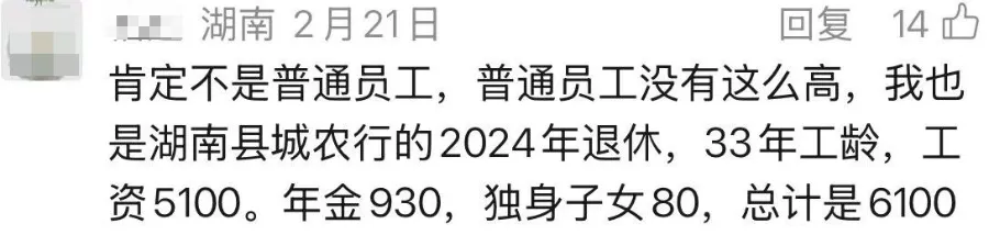 后台一网友留言说,我是湖南县城农行的2024年退休,33年工龄,工资5100。年金930,独身子女80,总计是6100。说实话,这个数放在县城,不算低了。咱干银行的都知道,全国普通银行员工退休的中位数也就6-7千块钱。很多人一听“银行退休”,以为个个都上万,其实真不是那么回事。基层员工干一辈子,退休就是这个水平。能拿到六千出头,年金还能跟着发,已经算不错了。农行这种大行,起码年金没断过,比有些地方强。银行这碗饭,听着光鲜,退休了一算账,也就是个普通企业员工的日子。好在稳定,月月准时到账,心里踏实。