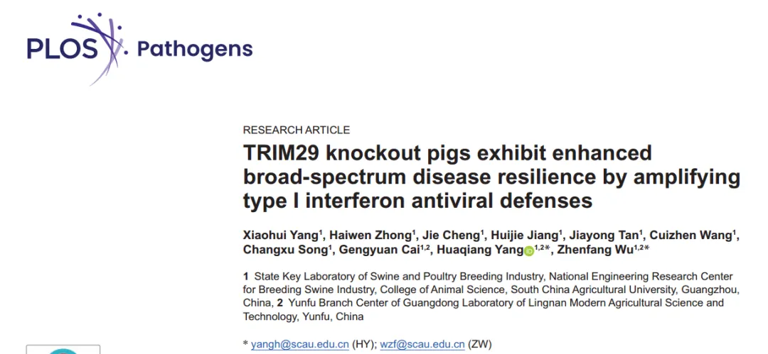 2026年3月2日,华南农业大学研究团队在PLOS PATHOGENS上发表题为“TRIM29 knockout pigs exhibit enhanced broad-spectrum disease resilience by amplifying type I interferon antiviral defenses”的最新研究论文。本研究成功地产生了对多种病毒表现出广谱抗病毒活性的抗病猪,没有观察到对猪健康的不利影响。