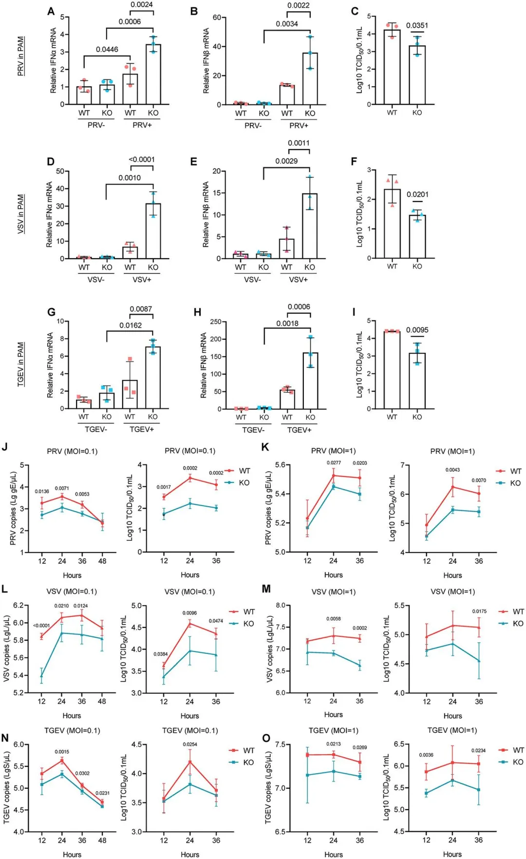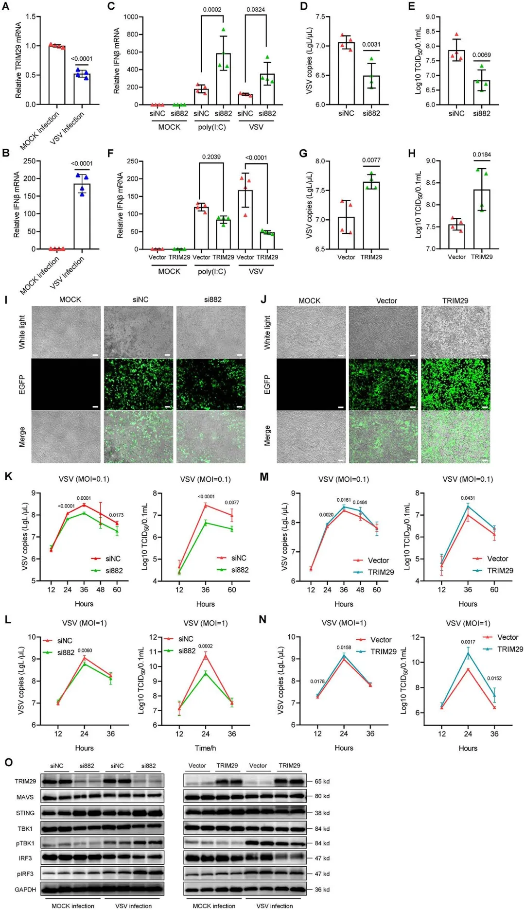 图1.TRIM29通过抑制I型IFN的产生支持PRV感染与DNA病毒PRV感染不同,VSV感染导致PK15细胞中TRIM29 mRNA水平下调,同时诱导超过150倍的IFNβ表达上调。通过siRNA介导的TRIM29敲低实验发现,抑制TRIM29表达可显著增强VSV诱导的IFNβ产生,而对基础IFNβ水平无影响。这种增强的抗病毒反应与VSV复制能力下降相关,表现为培养上清中病毒拷贝数和滴度明显降低,EGFP荧光示踪也证实VSV阳性细胞减少。相反,TRIM29过表达则减弱VSV诱导的IFNβ表达,促进病毒复制。病毒动力学研究显示,在不同感染复数条件下,TRIM29敲低持续抑制VSV增殖,而过表达则促进病毒复制。机制研究表明,与预期不同,VSV感染条件下MAVS蛋白水平在TRIM29敲低或过表达细胞中均无明显变化,提示MAVS可能不是PK15细胞中TRIM29调控VSV感染的关键下游效应分子。值得注意的是,在VSV感染条件下,TRIM29仍能调控STING蛋白表达,进而影响TBK1-IRF3信号轴的激活。图2.TRIM29通过抑制I型IFN的产生促进VSV感染3.Trim 29-KO小鼠对PRV和VSV感染具有弹性