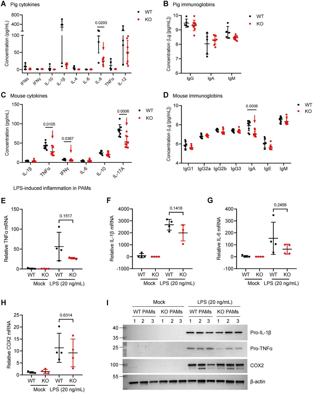 研究团队首先设计靶向TRIM29基因第一外显子的gRNA,转染猪胎儿成纤维细胞(PFF)后筛选获得双等位基因发生插入缺失(indels)的编辑细胞系作为供体细胞。随后进行体细胞核移植,共将胚胎移植至10头受体母猪,其中5头成功妊娠,最终获得31头克隆仔猪,26头健康存活。生长发育观察显示,TRIM29-KO克隆猪在后续饲养过程中未见明显发育异常或健康问题。基因型分析证实,所有克隆猪均携带与供体细胞相同的双等位基因编辑:一个等位基因发生1-bp插入,另一个发生1-bp缺失。鉴于TRIM29在皮肤组织中高表达,研究团队通过耳部皮肤活检进行免疫印迹验证,结果显示克隆猪皮肤中TRIM29蛋白完全检测不到,而野生型对照则呈现强表达,从蛋白水平确认了基因敲除的成功。安全性评估方面,研究团队利用Cas-Offinder和CRISPR软件预测了多达934个潜在脱靶位点,通过对TRIM29-KO猪进行全基因组测序并将数据比对至猪参考基因组(SSC11.1),对候选脱靶位点进行PCR扩增和Sanger测序验证,结果未检测到可识别的脱靶突变。研究人员将6头KO猪和15头品种匹配的5月龄野生型(WT)猪经鼻接种PRV病毒液(每鼻孔5 mL,滴度为1×10^6.9 TCID50/100 μL),并连续监测临床症状和体温变化。结果显示,KO组猪临床症状明显减轻,活动状态更佳,体温反应更平缓,死亡率显著低于WT组。至感染后第9天实验终点,15头WT猪中仅3头存活且呈现濒死状态,而6头KO猪中3头存活且临床表现正常。病毒学分析表明,KO猪在整个感染期间的口腔排毒水平持续低于WT组,脑组织和肺组织中的病毒载量显著降低,血清病毒载量在感染后第7天也呈现降低趋势。血清学检测显示,KO猪在感染后第7和9天的PRV gB和gE抗体水平均明显低于WT组,与其较低的病毒载量和减轻的疾病严重程度一致。进一步的细胞因子分析发现,KO猪血清中IFNα和IFNβ水平在病毒感染后持续高于WT组,脑组织中IFNα和IFNβ mRNA表达显著上调,ISG基因(MX1和ISG15)也呈现升高趋势。组织病理学检查显示,WT猪肺部呈现肺泡壁增厚伴炎细胞浸润,脑组织出现血管周围套袖现象;而KO猪组织病变明显减轻。免疫组化染色证实,WT猪脑和肺组织中PRV抗原信号更强且分布更广。图6.猪伪狂犬病病毒感染后Ⅰ型干扰素信号和组织病理学变化6.TRIM 29-KO猪源PAM对多种病毒具有弹性鉴于I型干扰素具有广谱抗病毒特性,研究人员对PRV(DNA病毒)、VSV(RNA病毒)和TGEV(冠状病毒)三种不同病毒进行了攻毒实验。结果显示,与野生型(WT)PAMs相比,TRIM29-KO PAMs在PRV感染后诱导了更高的IFNα和IFNβ表达,同时病毒滴度显著降低。类似的结果在VSV感染中得到验证:KO PAMs中I型干扰素水平升高,VSV复制能力下降。进一步对猪传染性胃肠炎病毒(TGEV)的感染实验表明,KO PAMs同样表现出增强的抗病毒能力,IFNα和IFNβ mRNA水平显著上调,病毒滴度降低。病毒动力学研究在不同感染复数(MOI=0.1和1)条件下进一步证实,PRV、VSV和TGEV三种病毒在KO PAMs中的复制动力学均受到明显抑制。这些结果一致表明,TRIM29-KO猪来源的PAMs通过增强的I型干扰素信号,对多种病毒病原体均表现出显著提高的抵抗力,不仅包括DNA病毒(PRV),还包括RNA病毒(VSV)和冠状病毒(TGEV),充分体现了TRIM29缺失赋予的广谱抗病毒效应。图7.从TRIM 29-KO猪分离的PAM对多种病毒具有弹性7.TRIM 29-KO小鼠和猪没有表现出升高的炎症水平对1月龄仔猪血清的多因子检测显示,TRIM29-KO猪与野生型(WT)对照组相比,包括IFNα、IFNγ、IL-1β、IL-6、TNFα在内的多种关键促炎和抗炎细胞因子浓度均处于相当水平,仅IL-8在KO组中呈现显著下调。体液免疫参数方面,两组间IgG、IgA、IgM免疫球蛋白水平无显著差异。对5周龄小鼠血清的分析表明,Trim29-KO小鼠的促炎因子TNFα、IFNγ和IL-17A浓度甚至低于对照组,而IL-1β、IL-6、IL-10等未见改变;免疫球蛋白谱系中仅IgA水平降低,其余亚型均无显著变化。为进一步评估病理条件下的炎症反应,研究人员利用脂多糖(LPS)诱导PAMs炎症模型。结果显示,在LPS刺激12小时后,KO和WT PAMs的促炎因子(TNFα、IL-1β、IL-6)及炎症标志物COX2的mRNA表达水平无显著差异;蛋白水平检测也证实pro-TNFα、pro-IL-1β和COX2的表达量在两组间相当。这些多层次的证据表明,TRIM29-KO小鼠和猪在生理条件下不呈现系统性炎症水平升高,甚至在部分指标上表现出更低的炎症基调;在LPS诱导的急性炎症刺激下,KO细胞也未出现过度的炎症反应。图8.TRIM 29-KO与WT猪和小鼠模型中炎症和免疫学特征的比较分析本研究首次系统揭示了E3泛素连接酶TRIM29作为I型干扰素信号通路的负调控因子,在猪抗病毒免疫中的关键作用。通过体外细胞实验证实,TRIM29敲低可显著增强PK15细胞对DNA病毒PRV和RNA病毒VSV的抗感染能力,其机制主要依赖于对STING蛋白的稳定性调控,进而激活TBK1-IRF3信号轴,促进I型干扰素产生。这一发现突破了传统认知中TRIM29仅特异性调控DNA或RNA病毒通路的局限,证明其通过靶向STING这一共同节点实现对广谱病毒的感受与调控。