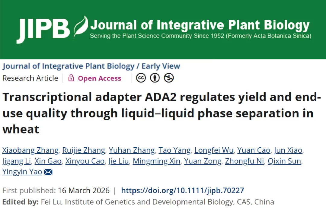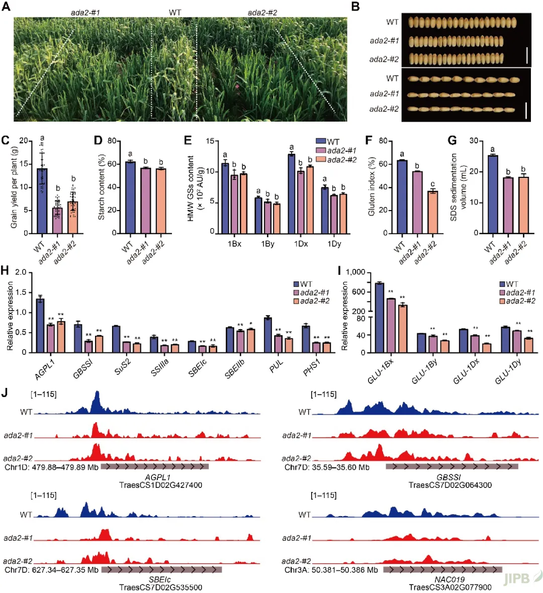 小麦是世界上重要的主粮作物, 其产量直接关系全球粮食安全。随着居民生活水平提升与消费升级, 品质改良也成为当前小麦育种工作的核心目标之一。淀粉和贮藏蛋白是决定小麦产量和加工品质的关键, 但目前人们对于协同调控小麦淀粉和贮藏蛋白的分子机制的理解仍然非常有限, 制约了小麦产量与品质的协同改良。前期研究发现, 组蛋白乙酰转移酶GCN5与转录因子CAMTA2相互作用, 调控淀粉和贮藏蛋白合成相关基因启动子区的组蛋白乙酰化和基因表达, 影响种子淀粉和贮藏蛋白的积累 (Zhang et al., 2024)。然而, ADA2作为GCN5衔接蛋白在小麦生长发育尤其是在籽粒发育过程中的分子机制尚不清楚。