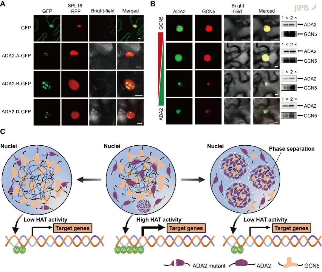 为了进一步探究ADA2的作用机制, 该研究首先通过亚细胞定位实验分析, 发现ADA2发生液-液相分离 (LLPS) 并形成细胞核凝聚体 (图 2A)。ADA2含有两个内在无序结构域 (IDR1和IDR2), 其中IDR2是驱动ADA2发生相分离的关键区域, 且该区域与GCN5互作的区域高度重合。因此, GCN5与ADA2的互作可能会调控其相分离的形成。体外实验结果证实, GCN5通过与ADA2的互作影响了ADA2相分离, 两者的浓度比例决定了相分离行为及功能输出: 高浓度的GCN5可溶解ADA2凝聚体, 维持高水平的乙酰化活性, 而过量的ADA2则通过形成共凝聚体来隔离GCN5, 拮抗其乙酰化活性 (图 2B–C)。这可能是一种潜在的动态调控机制, 通过精确调控转录的复合物中各组分的丰度, 有效调控下游靶基因转录。最后该研究对448份小麦种质资源ADA2自然等位变异进行分析, 鉴定到ADA2-B在小麦自然群体中存在2种单倍型。其中, 携带Hap2单倍型与更高的千粒重有关, 为小麦高产育种提供了新的候选基因。