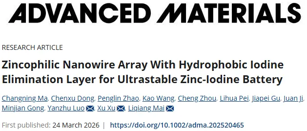2026年03月24日,武汉理工大学麦立强副校长、许絮团队在Advanced Materials期刊发表题为“Zincophilic Nanowire Array With Hydrophobic Iodine Elimination Layer for Ultrastable Zinc-Iodine Battery”的研究论文,团队成员马常宁、冬晨旭为论文共同第一作者,麦立强、许絮、华中农业大学罗艳珠为论文共同通讯作者。