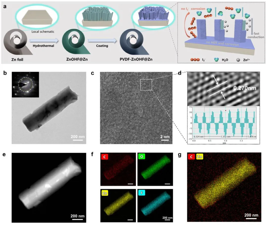图1 | PVDF-ZnOHF@Zn电极的制备与表征。(a)PVDF-ZnOHF@Zn电极的制备示意图及其作用机理。(b)ZnOHF纳米线的高分辨TEM图像及相应的选区电子衍射(SAED)图像。(c)HRTEM图像和(d)晶面间距测量图像。(e-f)PVDF-ZnOHF@Zn电极的STEM图像及相应的元素分布图像。