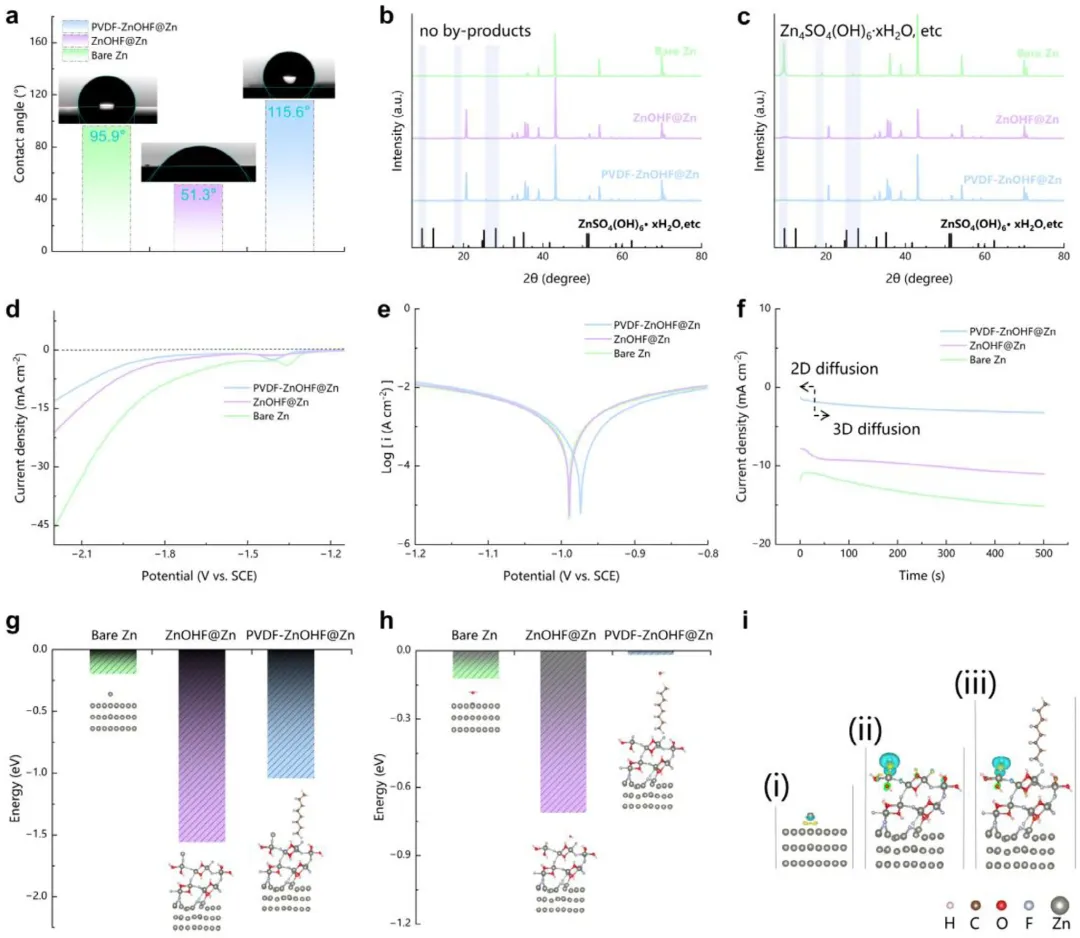 图2 | PVDF-ZnOHF@Zn电极的副反应稳定性。(a)2M ZnSO₄电解液在不同电极上的接触角。不同电极在2M ZnSO₄水溶液中浸泡7天(b)前和(c)后的XRD图谱。(d)不同电极在1 mV s⁻¹扫描速率下的LSV曲线和(e)塔菲尔极化曲线。(f)不同电极在-150 mV过电位下的计时电流曲线。(g)锌原子和(h)H₂O分子吸附在不同电极表面的吸附能。(g,h)中的插图为密度泛函理论DFT计算的优化模型。(i)(i)裸Zn、(ii)ZnOHF@Zn和(iii)PVDF-ZnOHF@Zn在Zn吸附诱导下的电荷密度差。