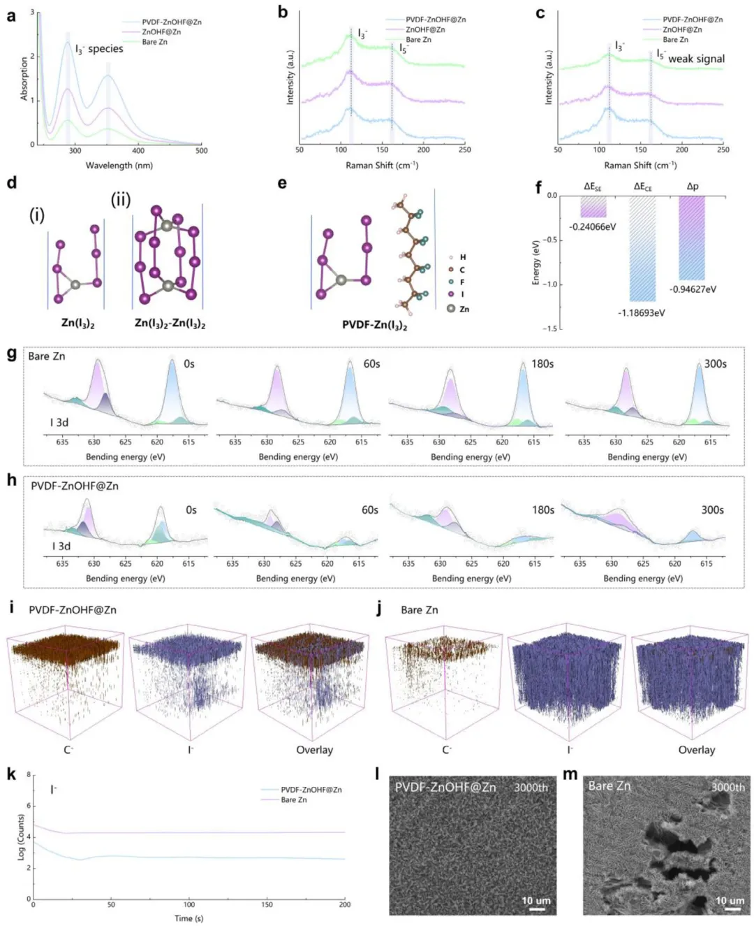 图3 | PVDF-ZnOHF@Zn电极的多碘离子耐受性及机理分析。(a)在2 mmol L⁻¹ I₃⁻溶液中进行吸附测试的紫外-可见吸收光谱。三种电极的多碘化物溶液的拉曼光谱,(b)浸泡前和(c)浸泡后。(d)(i)Zn(I₃)₂和(ii)Zn(I₃)₂-Zn(I₃)₂的优化构型。(e)Zn(I₃)₂在PVDF上的优化吸附构型。(f)I₃⁻的ΔECE、ΔESE和ΔP的能量比较。(g)裸Zn和(h)PVDF-ZnOHF@Zn刻蚀后的I 3d XPS谱图。(i)PVDF-ZnOHF@Zn和(j)裸Zn的飞行时间二次离子质谱溅射体积中C⁻和I⁻的三维可视化图。(k)对应的I⁻的飞行时间二次离子质谱深度剖析图。(l)PVDF-ZnOHF@Zn和(m)裸Zn在3000次循环后的扫描电子显微镜图像。(l,m)比例尺为10 μm。