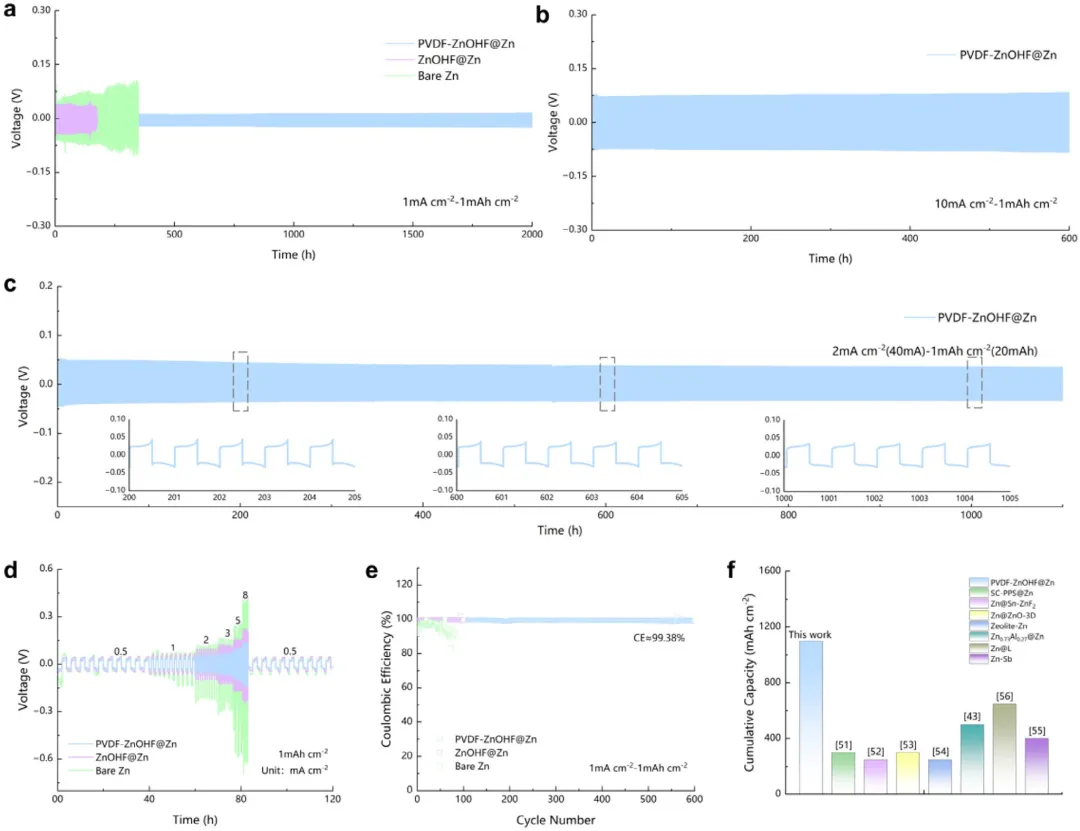 图5 | PVDF-ZnOHF@Zn电极的电化学性能。对称电池在电流密度/容量为(a)1 mA cm⁻²/1 mAh cm⁻²和(b)10 mA cm⁻²/1 mAh cm⁻²下的电压曲线。(c)软包对称电池在2 mA cm⁻²(40 mA)/1 mAh cm⁻²(20 mAh)电流密度/容量下的电压曲线。(d)裸Zn、ZnOHF@Zn和PVDF-ZnOHF@Zn电极的倍率性能。(e)三种电极的库仑效率曲线。(f)该研究中PVDF-ZnOHF@Zn电极与先前报道的锌负极研究的比较。
