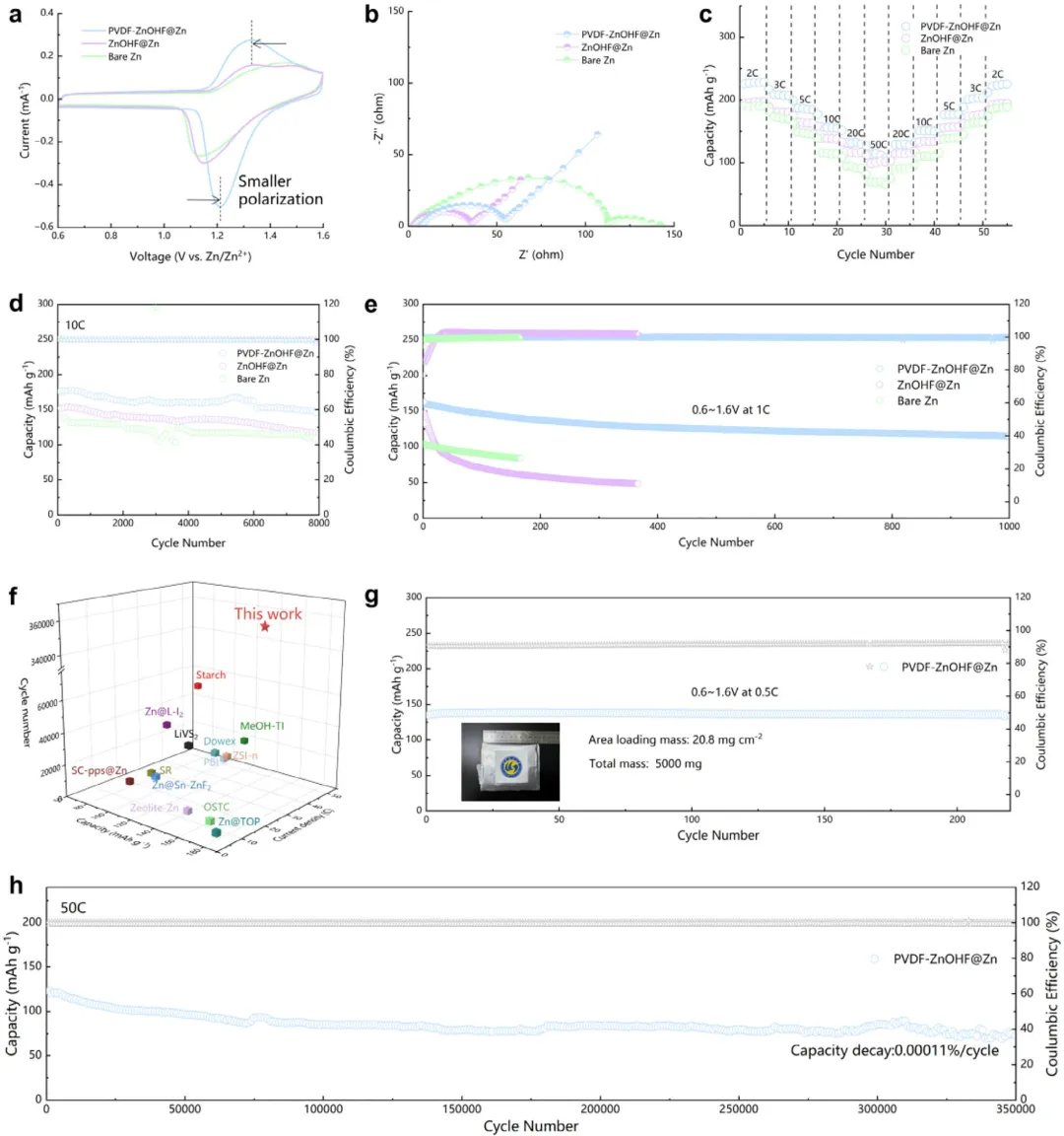 在此,该研究设计了一种可持续无枝晶、无腐蚀稳定锌负极,其具有亲锌性和疏水性的双向协同效应,涉及三维亲锌ZnOHF纳米线阵列和疏水碘去除层PVDF。原位构建的纳米线阵列具有连续、高度有序且完全暴露的单个纳米结构活性表面。电场分布、锌离子通量和局部电流密度得到优化,以诱导锌在纳米线阵列底部均匀沉积。PVDF提供疏水碘消除效应,具有疏水性,使I₃⁻/I₅⁻副产物不溶于PVDF聚合物并通过多种功能被排斥。其能有效防止同步电解液和多碘化物对锌负极腐蚀导致的容量衰减和循环寿命缩短。此外,这两种效应的协同作用在锌负极表面形成了均匀的混合固态电解质界面(SEI),诱导稳定的非枝晶锌沉积。这种协同设计不仅优化了快速锌传导以增强电池的快速充电能力,而且有效抑制了电解液/多碘化物与锌负极之间的不良反应,即使在高电流密度/容量下也表现出优异的电化学性能。因此,协同锌负极在10 mA cm⁻²/1 mAh cm⁻²的电流密度下表现出600小时的稳定循环,远优于无协同设计的负极和裸锌。组装的大面积软包对称电池在2 mA cm⁻²(40 mA)/1 mAh cm⁻²(20 mAh)的高电流密度/容量下稳定循环了1100小时。更重要的是,所制备的Zn-I₂全电池实现了迄今为止报道的最长350000次循环,每圈容量衰减最小,为0.00011%。该研究为可持续高性能锌负极提供了一种参考策略,并为推动Zn-I₂电池的实际应用开辟了一条可能的途径。