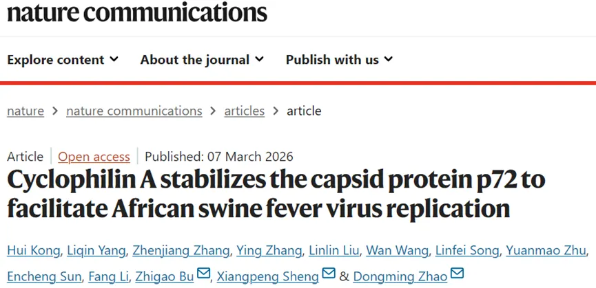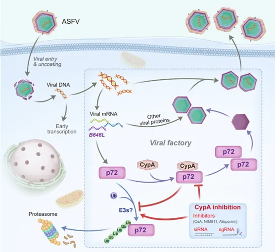 本研究的机制解析显示,CypA-p72相互作用是ASFV高效复制的关键环节,为病毒生命周期提供了宿主依赖的稳定性调控模块。这一发现不仅揭示了衣壳蛋白稳定性调控的新途径,还提示靶向CypA可能成为抗ASFV的潜在策略。例如,小分子抑制剂干扰CypA-p72结合或可阻断病毒复制,为药物研发提供新方向。该研究发表于《Nature Communications》,强调了宿主因子在病毒感染中的重要作用,推动了ASFV病理机制的深入理解,对未来疫病防控具有重要参考价值。
