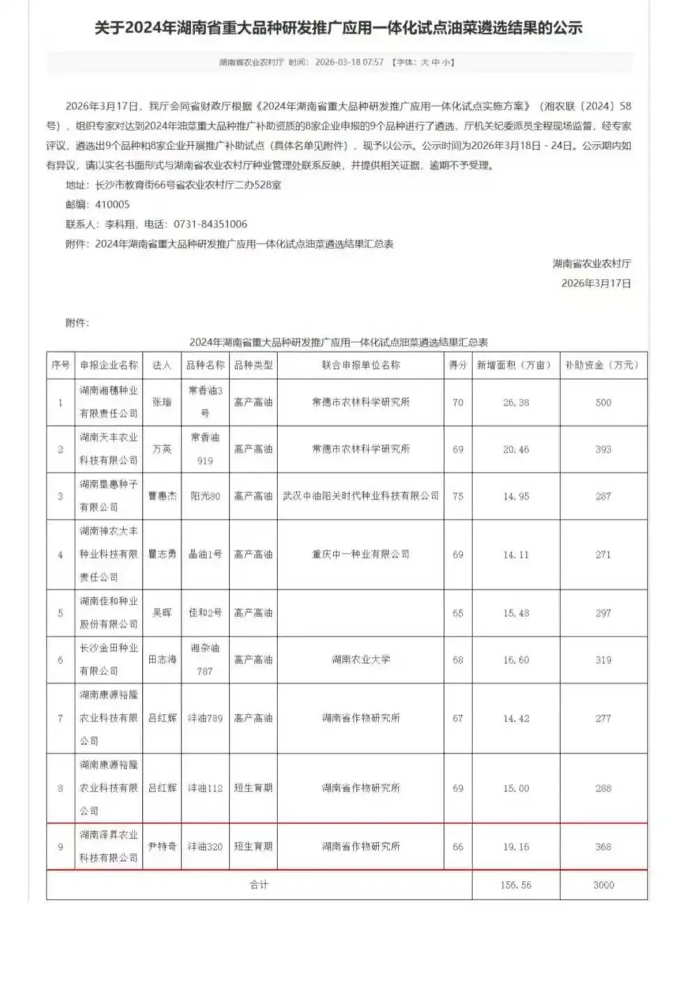 近日,湖南省农业农村厅正式公示《2024年湖南省重大品种研发推广应用一体化试点油菜遴选结果》,湖南泽昇农业科技有限公司凭借短生育期油菜品种「沣油320」成功入选,获得省级重大品种后补助资格!