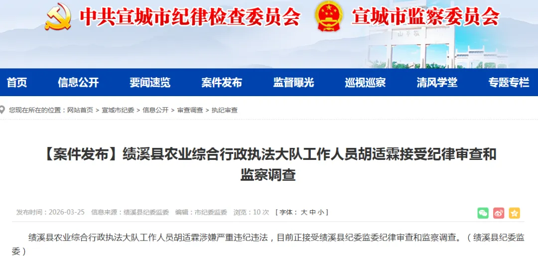 绩溪县农业综合行政执法大队工作人员胡适霖涉嫌严重违纪违法,目前正接受绩溪县纪委监委纪律审查和监察调查。(绩溪县纪委监委)