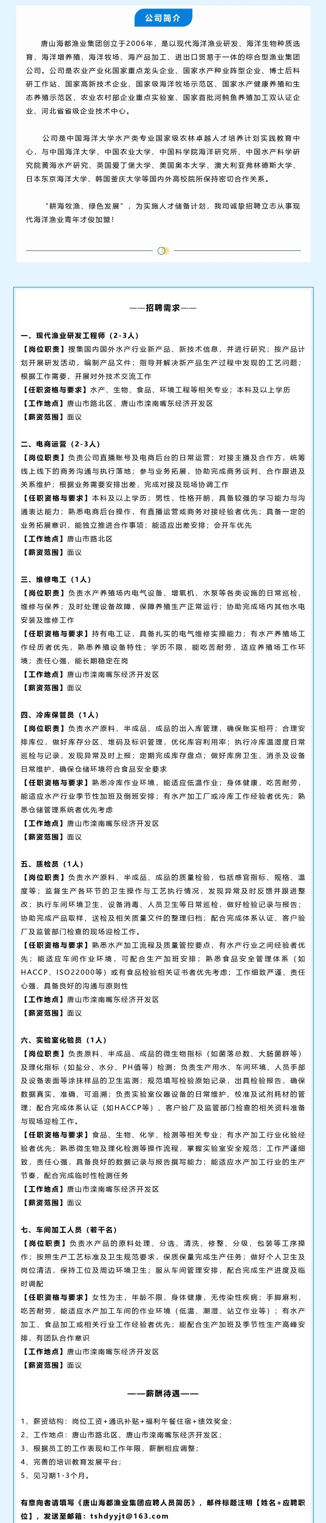 唐山海都渔业集团2026年春季人才招聘启事