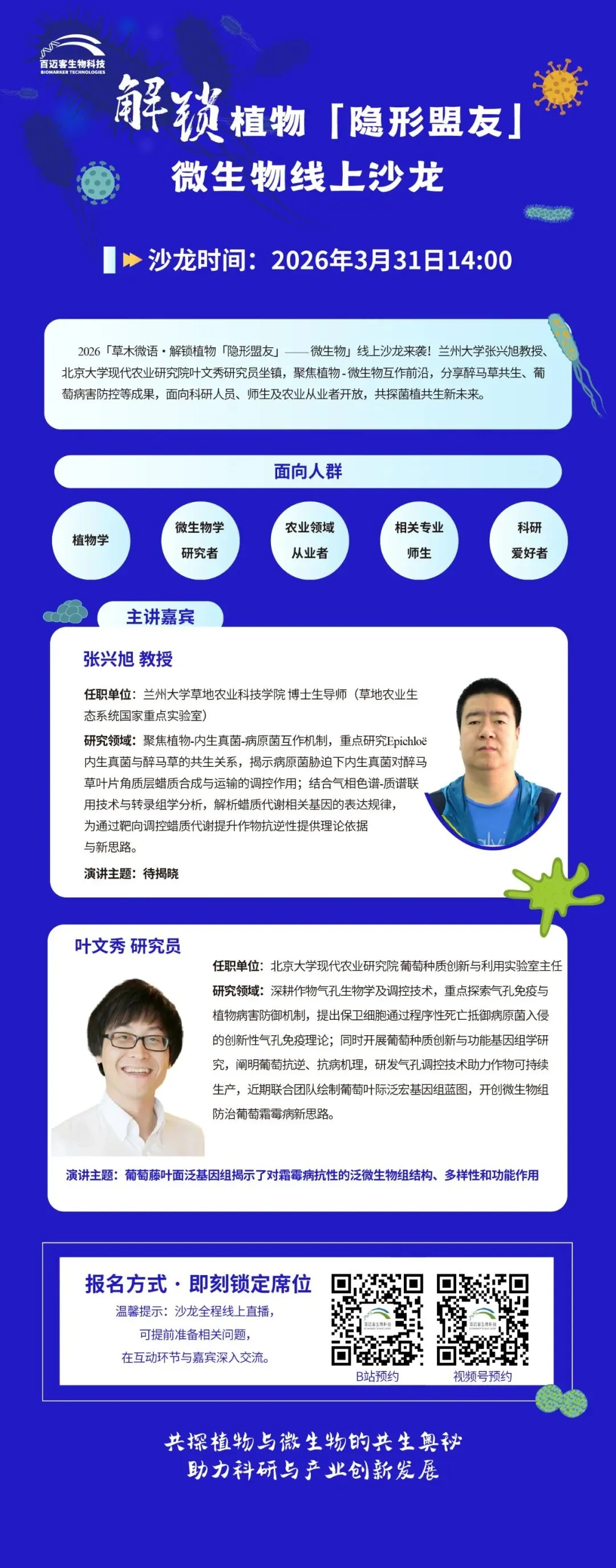 当植物遇上微生物,藏着多少共生互作的科研奥秘与产业新可能?3月31日14:00植物微生物主题线上沙龙重磅来袭,兰州大学张兴旭教授、北京大学现代农业研究院叶文秀研究员双名校顶尖学者坐镇,直击植物—微生物互作前沿研究成果,从醉马草共生机制到葡萄霜霉病微生物防控,覆盖基础研究与产业应用。植物学、微生物学研究者、相关师生及农业从业者均可线上参与,实时提问互动,解锁专属科研指导,搭建高质量学术交流平台,共探菌植共生的科研与产业新未来!