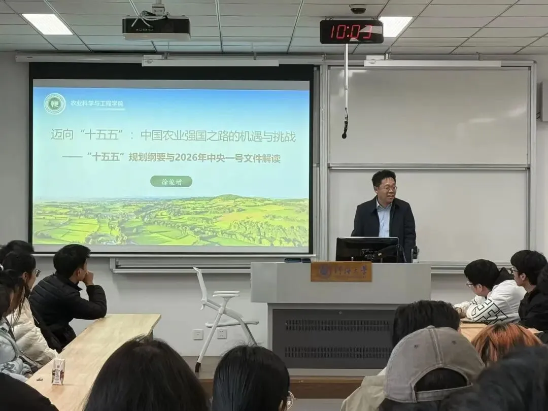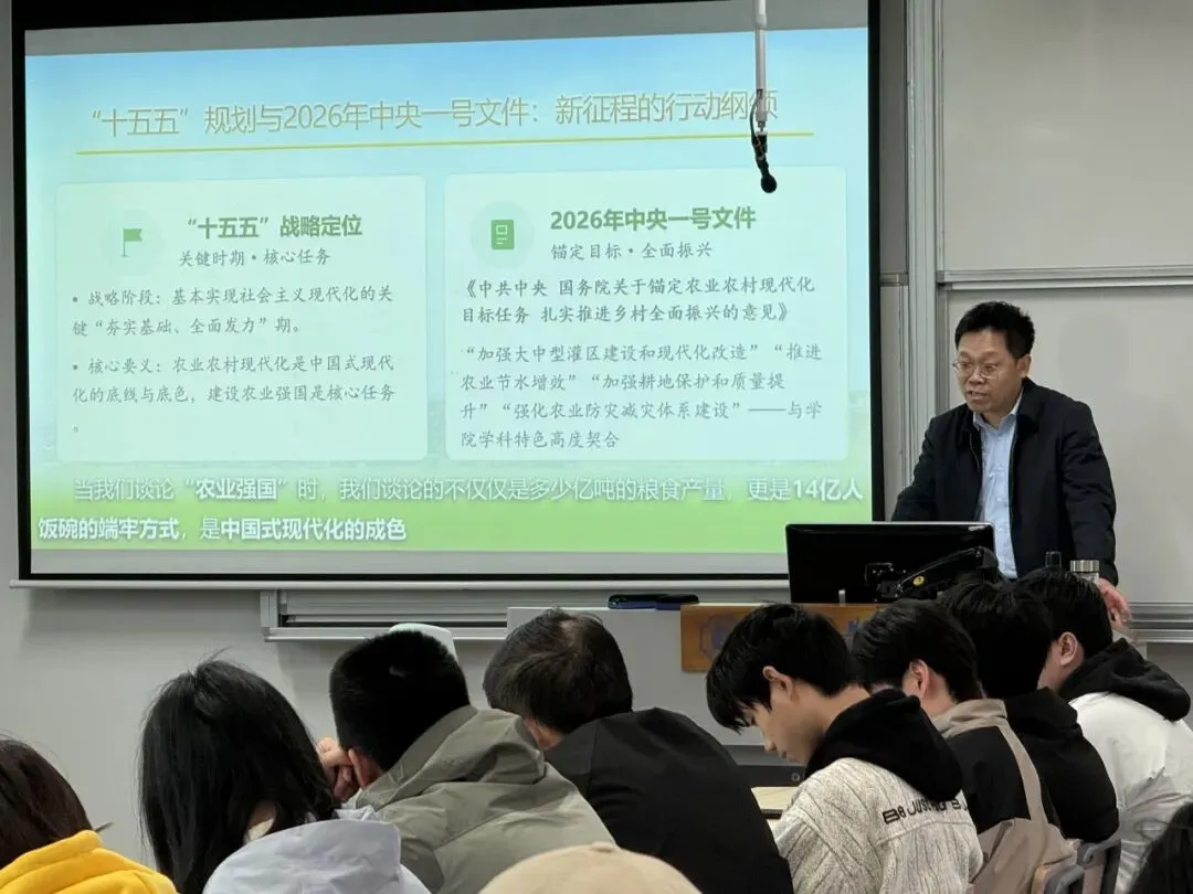 徐院长立足“十四五”农业发展成绩单,结合2026年中央一号文件,用详实的数据、鲜活的案例,系统梳理了“十四五”期间我国农业综合生产能力、脱贫攻坚成果、农民收入、乡村建设等方面的重大成就——粮食产量连续两年稳定在1.4万亿斤以上,农业科技进步贡献率超64%,主要粮食作物已基本实现全程机械化,让同学们直观感受我国农业发展的坚实基础。徐院长还围绕“十五五”规划与中央一号文件明确的“四项重点任务、两大支撑保障”,结合政策原文与权威数据,向同学们阐述了“十五五”时期农业强国建设的机遇与挑战。