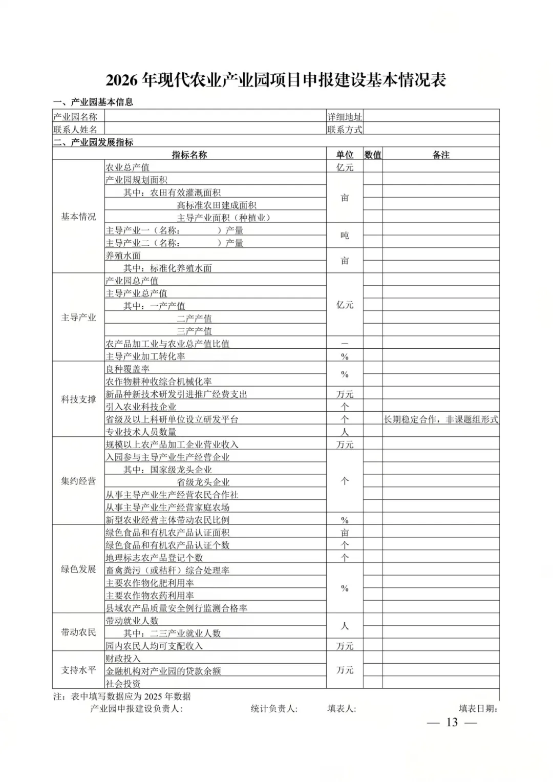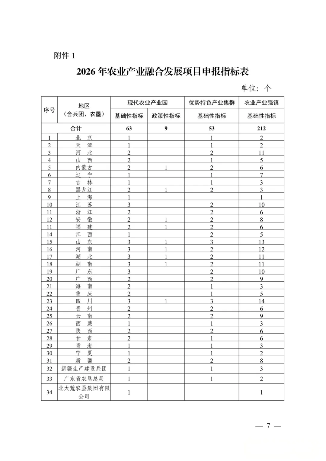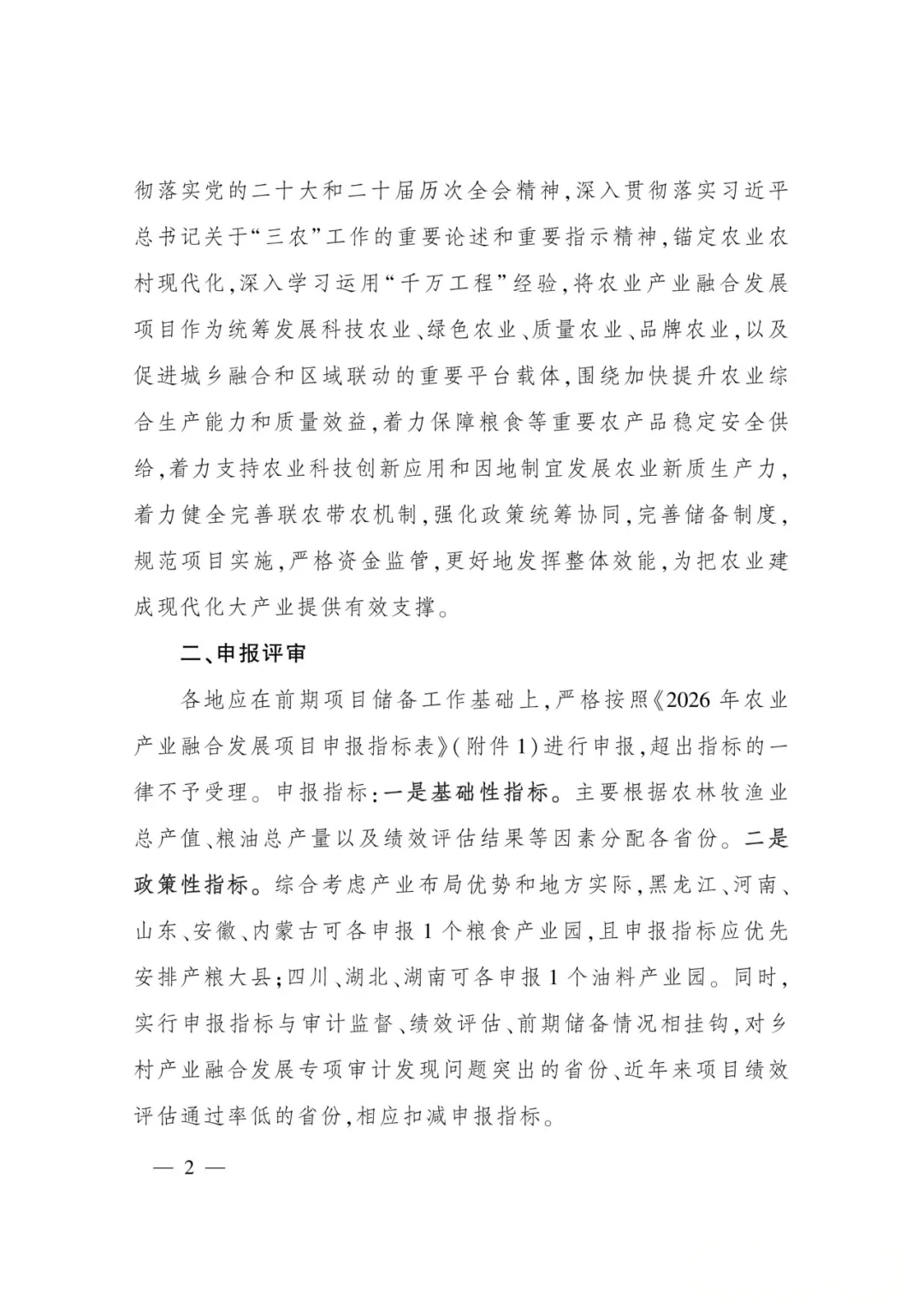 各地应在前期项目储备工作基础上,严格按照《2026年农业产业融合发展项目申报指标表》 (附件1)进行申报,超出指标的一律不予受理。 申报指标:一是基础性指标。 主要根据农林牧渔业总产值、粮油总产量以及绩效评估结果等因素分配各省份。 二是政策性指标。 综合考虑产业布局优势和地方实际,黑龙江、河南、山东、安徽、内蒙古可各申报1个粮食产业园,且申报指标应优先安排产粮大县;四川、湖北、湖南可各申报1个油料产业园。 同时,实行申报指标与审计监督、绩效评估、前期储备情况相挂钩,对乡村产业融合发展专项审计发现问题突出的省份、近年来项目绩效评估通过率低的省份,相应扣减申报指标。