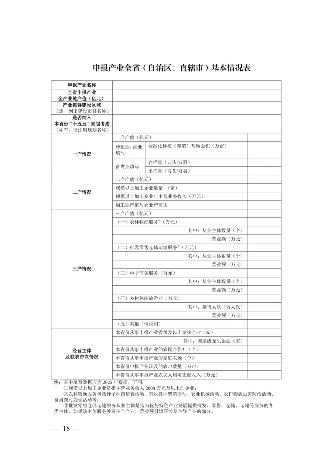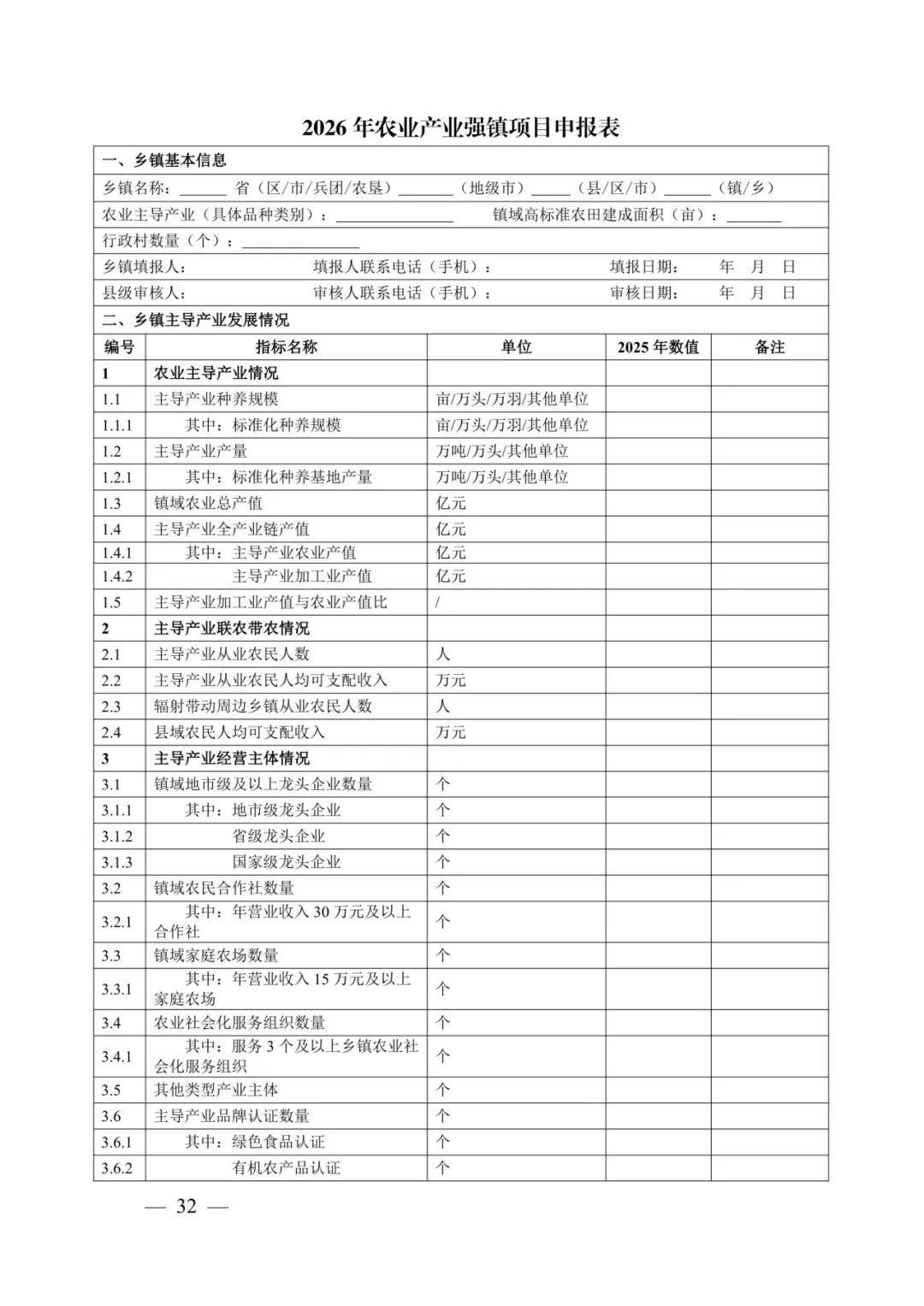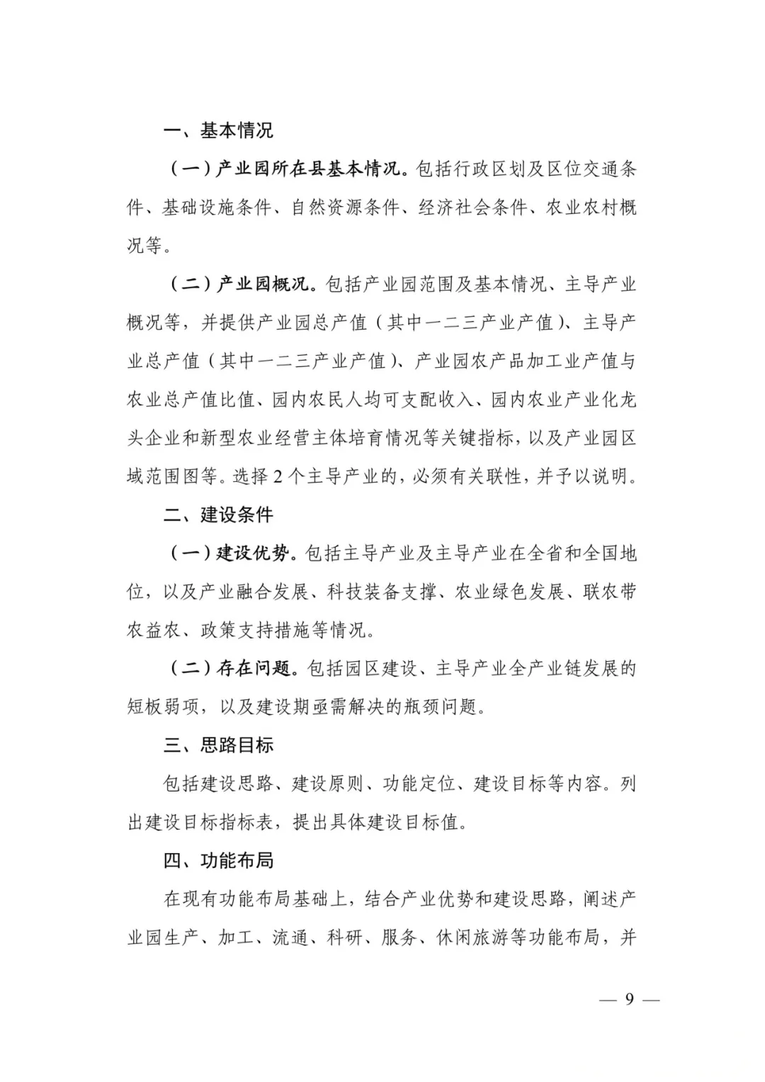各地应在前期项目储备工作基础上,严格按照《2026年农业产业融合发展项目申报指标表》 (附件1)进行申报,超出指标的一律不予受理。 申报指标:一是基础性指标。 主要根据农林牧渔业总产值、粮油总产量以及绩效评估结果等因素分配各省份。 二是政策性指标。 综合考虑产业布局优势和地方实际,黑龙江、河南、山东、安徽、内蒙古可各申报1个粮食产业园,且申报指标应优先安排产粮大县;四川、湖北、湖南可各申报1个油料产业园。 同时,实行申报指标与审计监督、绩效评估、前期储备情况相挂钩,对乡村产业融合发展专项审计发现问题突出的省份、近年来项目绩效评估通过率低的省份,相应扣减申报指标。