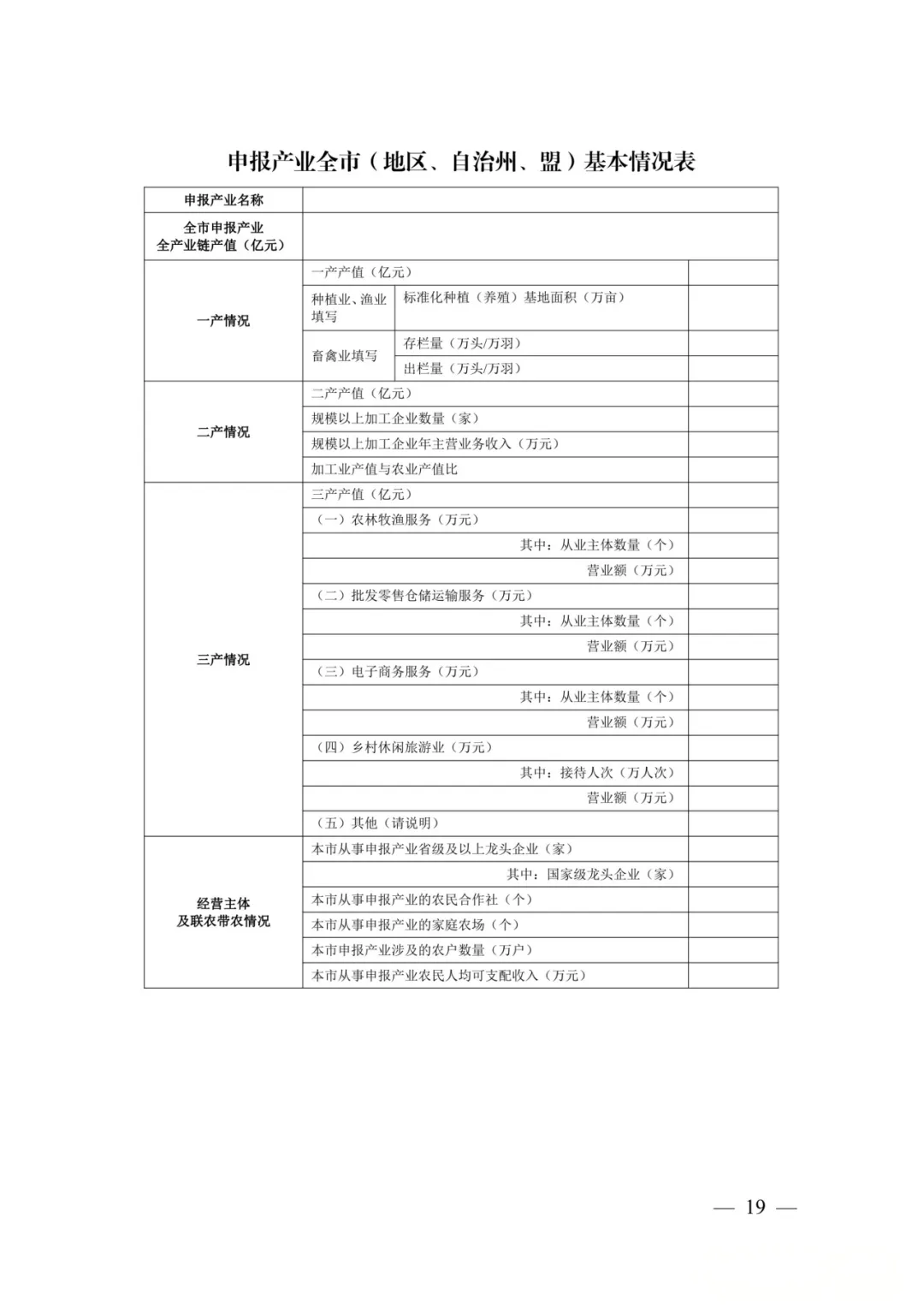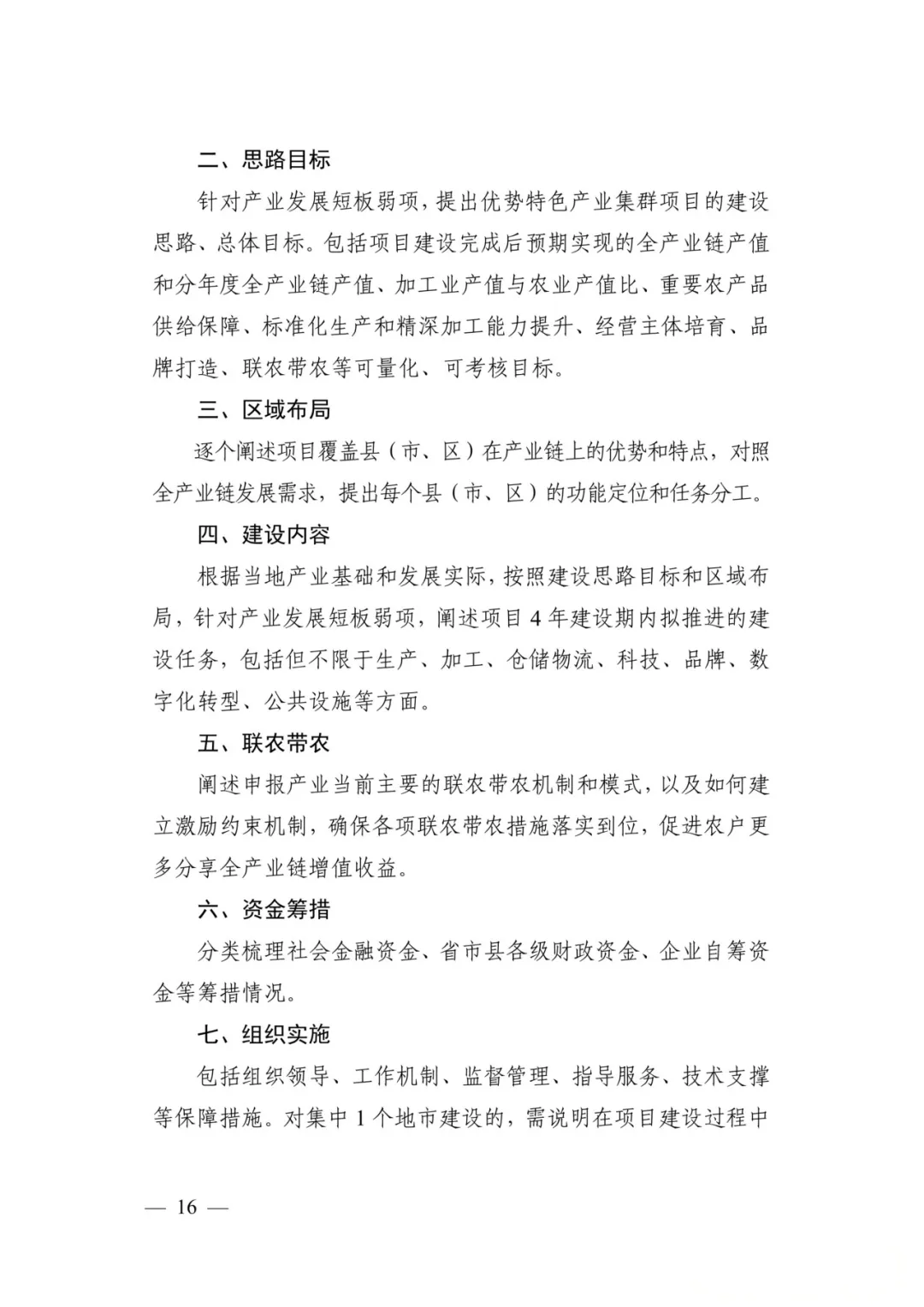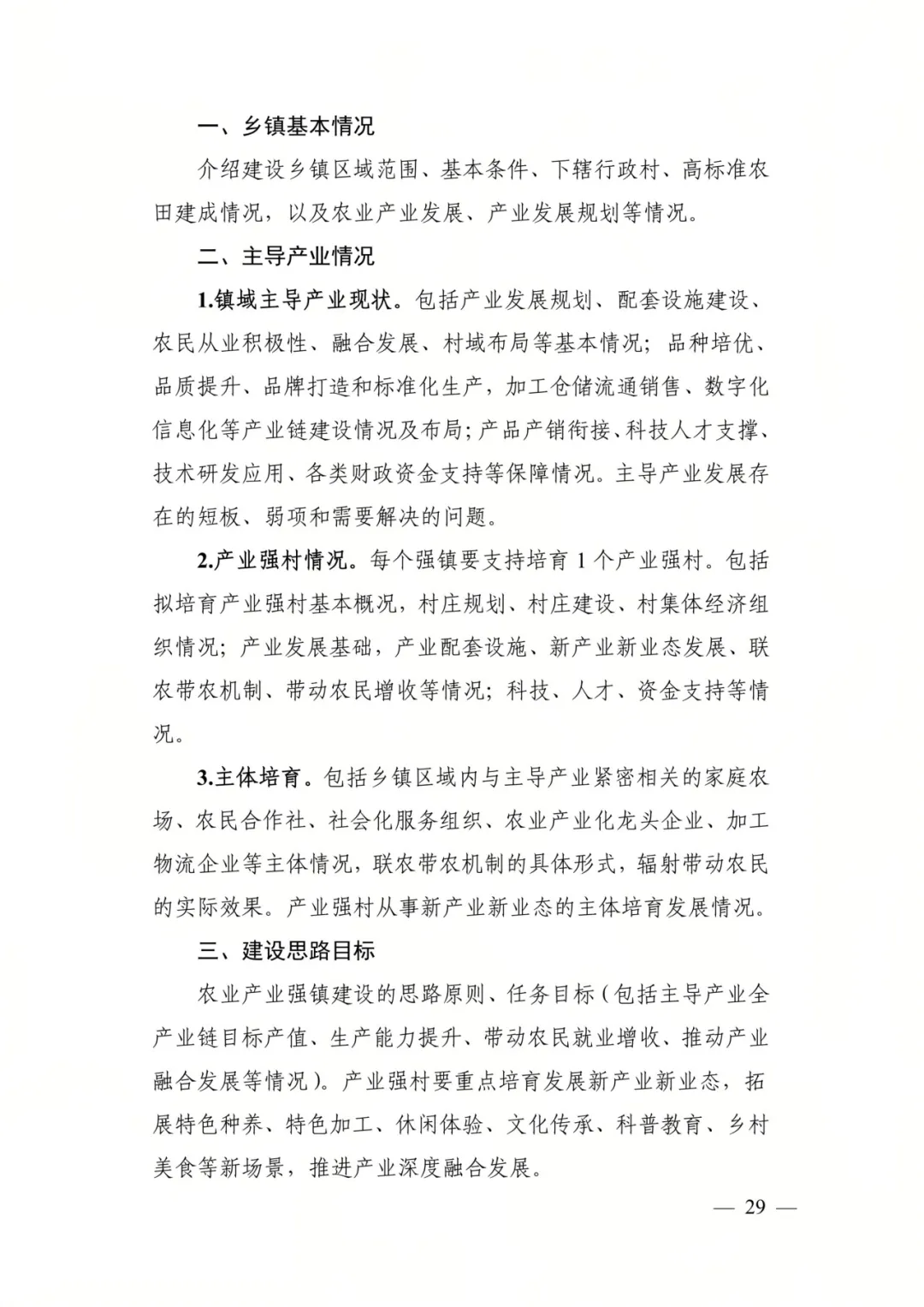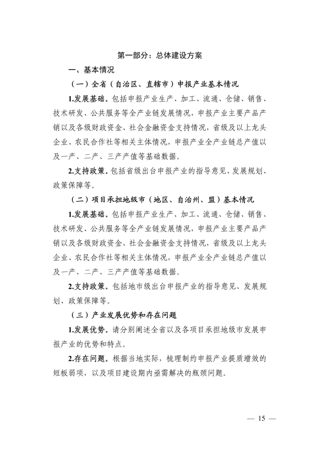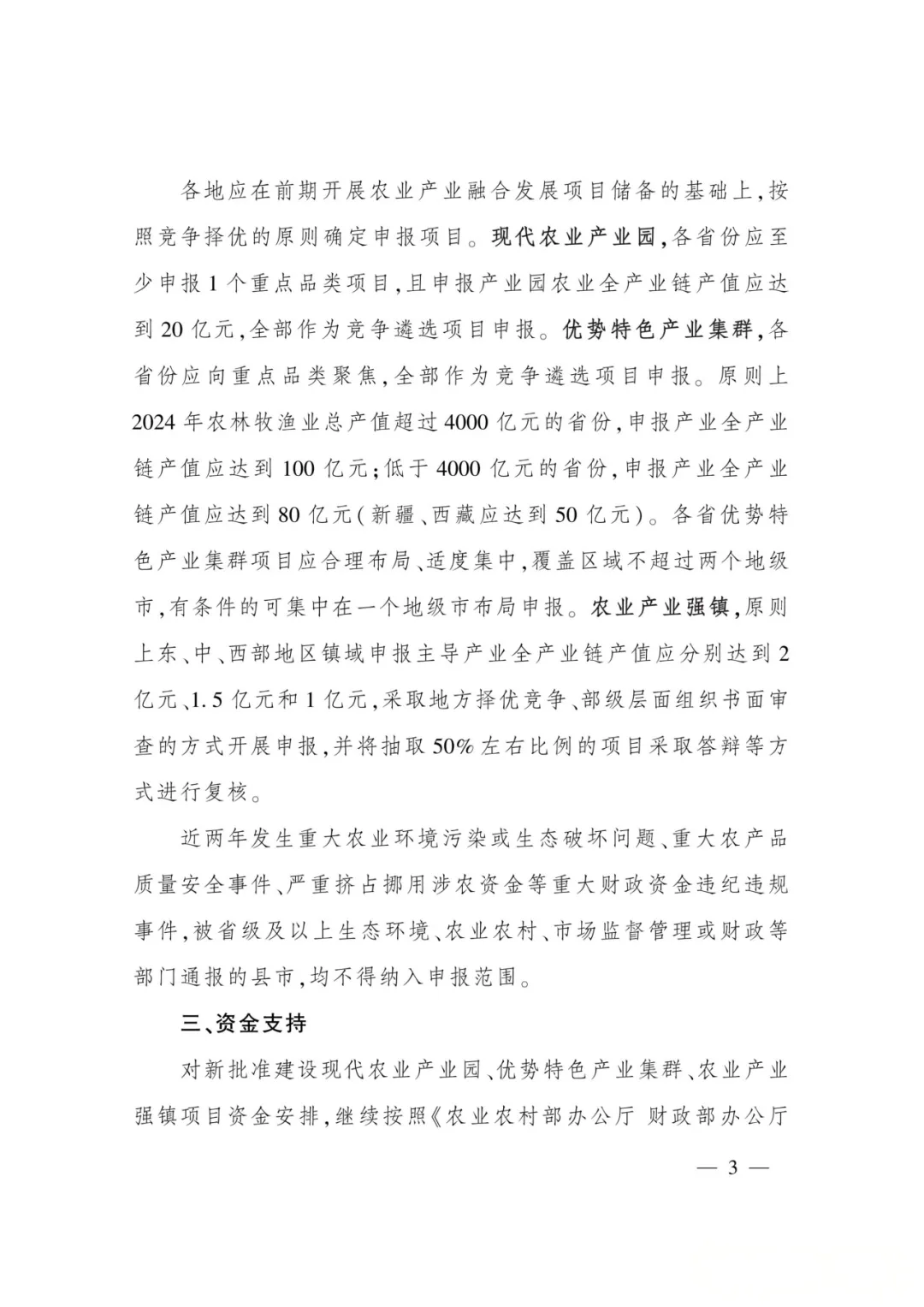 各地应在前期开展农业产业融合发展项目储备的基础上,按照竞争择优的原则确定申报项目。 现代农业产业园,各省份应至少申报1个重点品类项目,且申报产业园农业全产业链产值应达到20亿元,全部作为竞争遴选项目申报。优势特色产业集群,各省份应向重点品类聚焦,全部作为竞争遴选项目申报。 原则上2024年农林牧渔业总产值超过4000亿元的省份,申报产业全产业链产值应达到100亿元;低于4000亿元的省份,申报产业全产业链产值应达到80亿元(新疆、西藏应达到50亿元) 。 各省优势特色产业集群项目应合理布局、适度集中,覆盖区域不超过两个地级市,有条件的可集中在一个地级市布局申报。 农业产业强镇,原则上东、中、西部地区镇域申报主导产业全产业链产值应分别达到2亿元、1.5亿元和1亿元,采取地方择优竞争、部级层面组织书面审查的方式开展申报,并将抽取50%左右比例的项目采取答辩等方式进行复核。