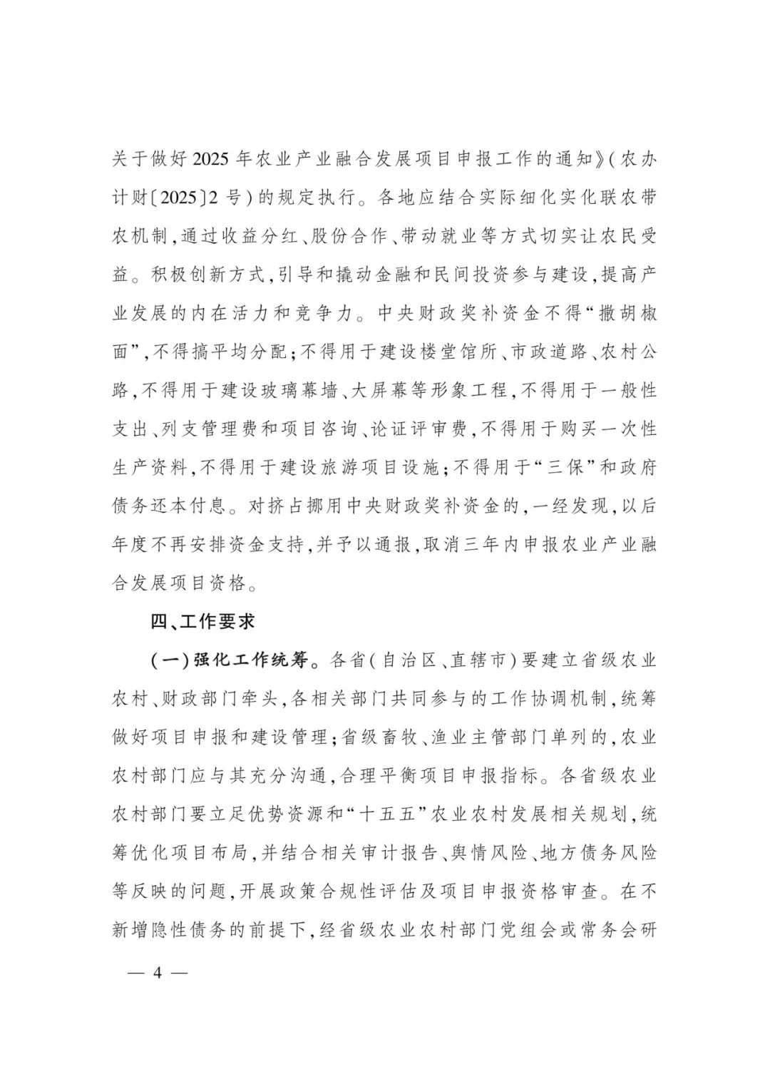 对新批准建设现代农业产业园、优势特色产业集群、农业产业强镇项目资金安排,继续按照《农业农村部办公厅 财政部办公厅关于做好2025年农业产业融合发展项目申报工作的通知》 (农办计财〔2025〕2号) 的规定执行。 各地应结合实际细化实化联农带农机制,通过收益分红、股份合作、带动就业等方式切实让农民受益。 积极创新方式,引导和撬动金融和民间投资参与建设,提高产业发展的内在活力和竞争力。中央财政奖补资金不得“ 撒胡椒面” ,不得搞平均分配;不得用于建设楼堂馆所、市政道路、农村公路,不得用于建设玻璃幕墙、大屏幕等形象工程,不得用于一般性支出、列支管理费和项目咨询、论证评审费,不得用于购买一次性生产资料,不得用于建设旅游项目设施;不得用于“ 三保” 和政府债务还本付息。对挤占挪用中央财政奖补资金的,一经发现,以后年度不再安排资金支持,并予以通报,取消三年内申报农业产业融合发展项目资格。