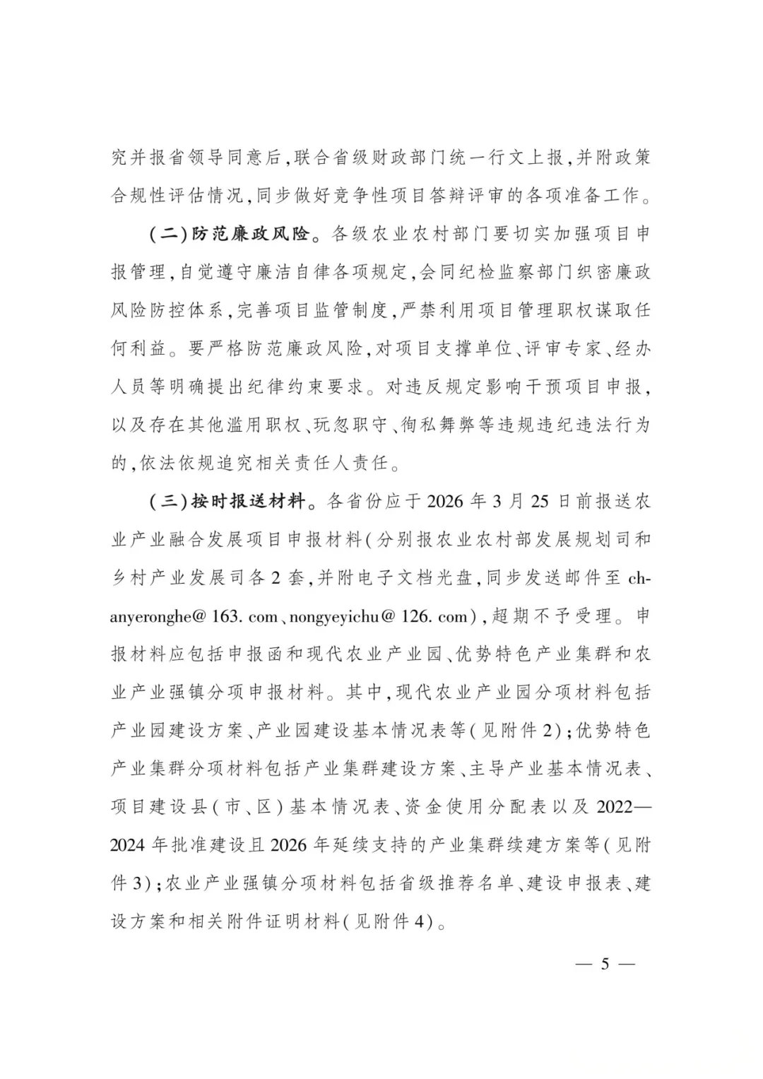(三)按时报送材料。 各省份应于2026年3月25日前报送农业产业融合发展项目申报材料(分别报农业农村部发展规划司和乡村产业发展司各2套,并附电子文档光盘,同步发送邮件至chanyeronghe@163.com、nongyeyichu@126.com) ,超期不予受理。