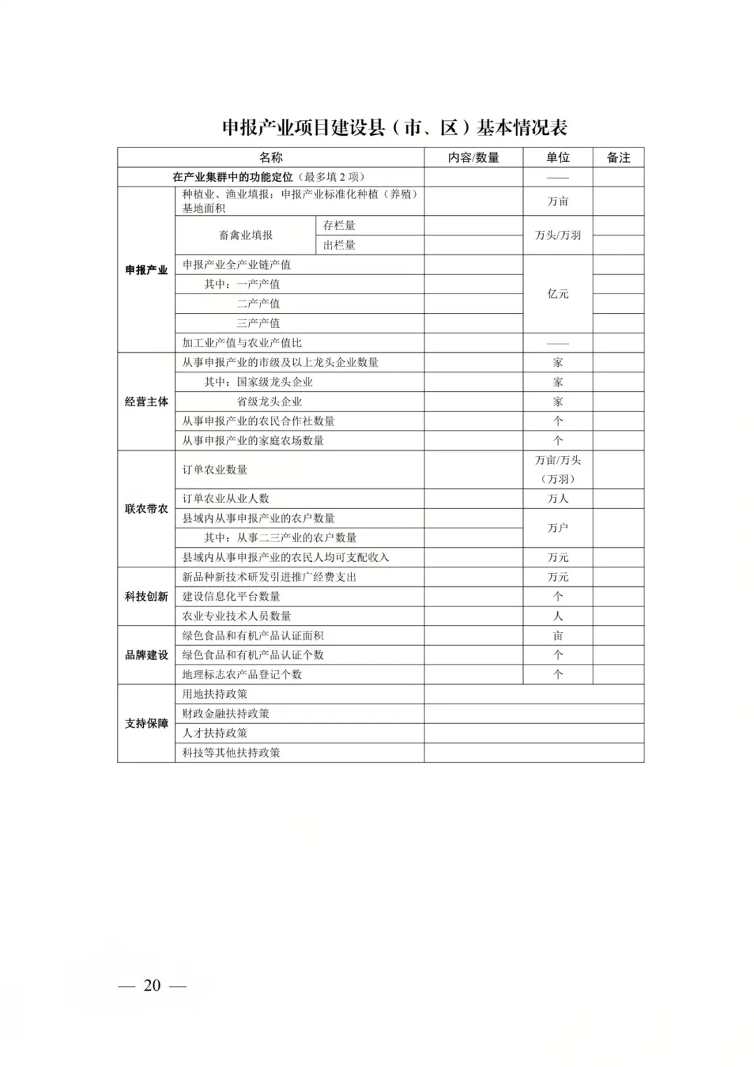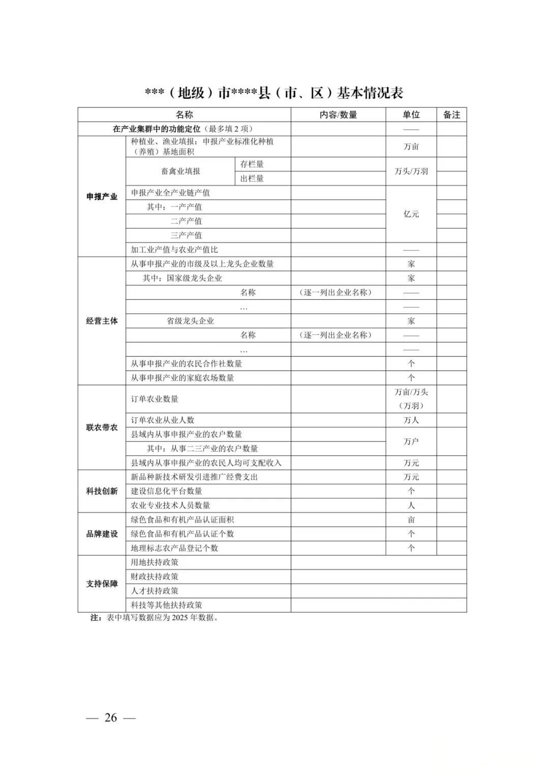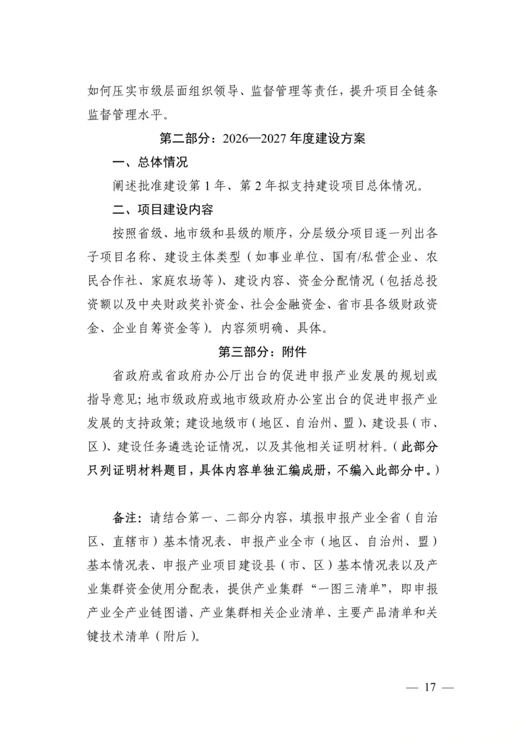 申报材料应包括申报函和现代农业产业园、优势特色产业集群和农业产业强镇分项申报材料。 其中,现代农业产业园分项材料包括产业园建设方案、产业园建设基本情况表等(见附件2) ;优势特色产业集群分项材料包括产业集群建设方案、主导产业基本情况表、项目建设县 ( 市、区) 基本情况表、资金使用分配表以及2022—2024年批准建设且2026年延续支持的产业集群续建方案等(见附件3) ;农业产业强镇分项材料包括省级推荐名单、建设申报表、建设方案和相关附件证明材料(见附件4) 。