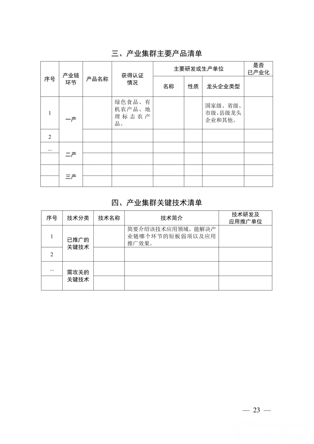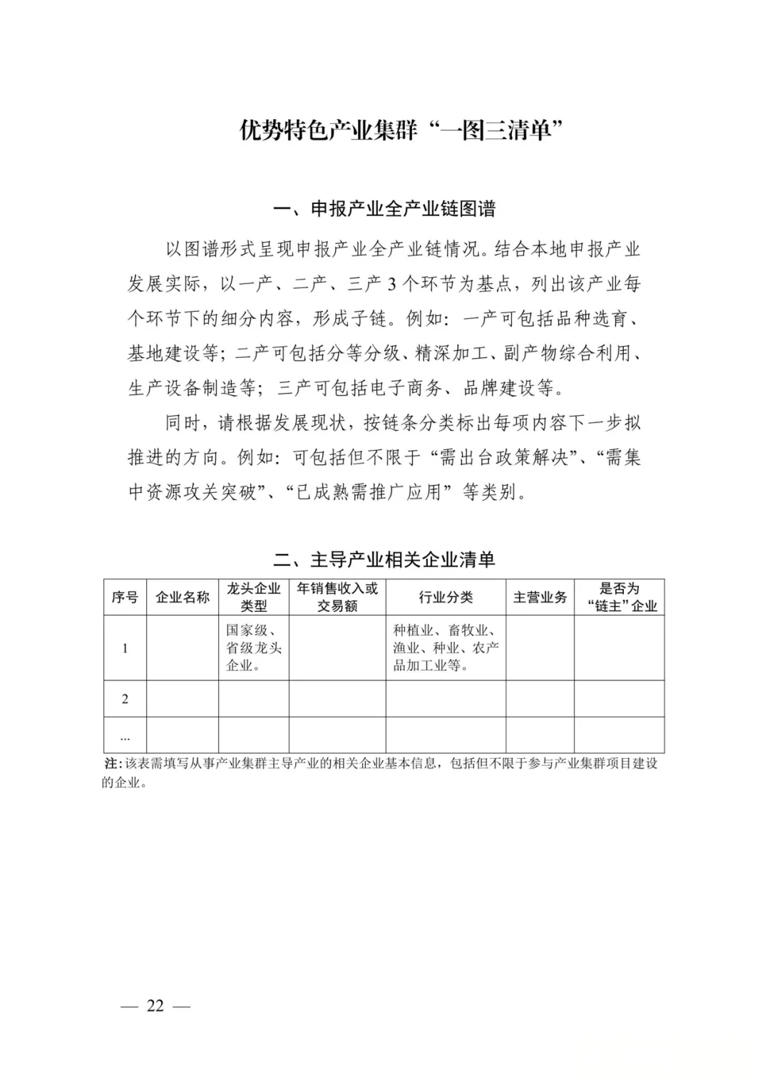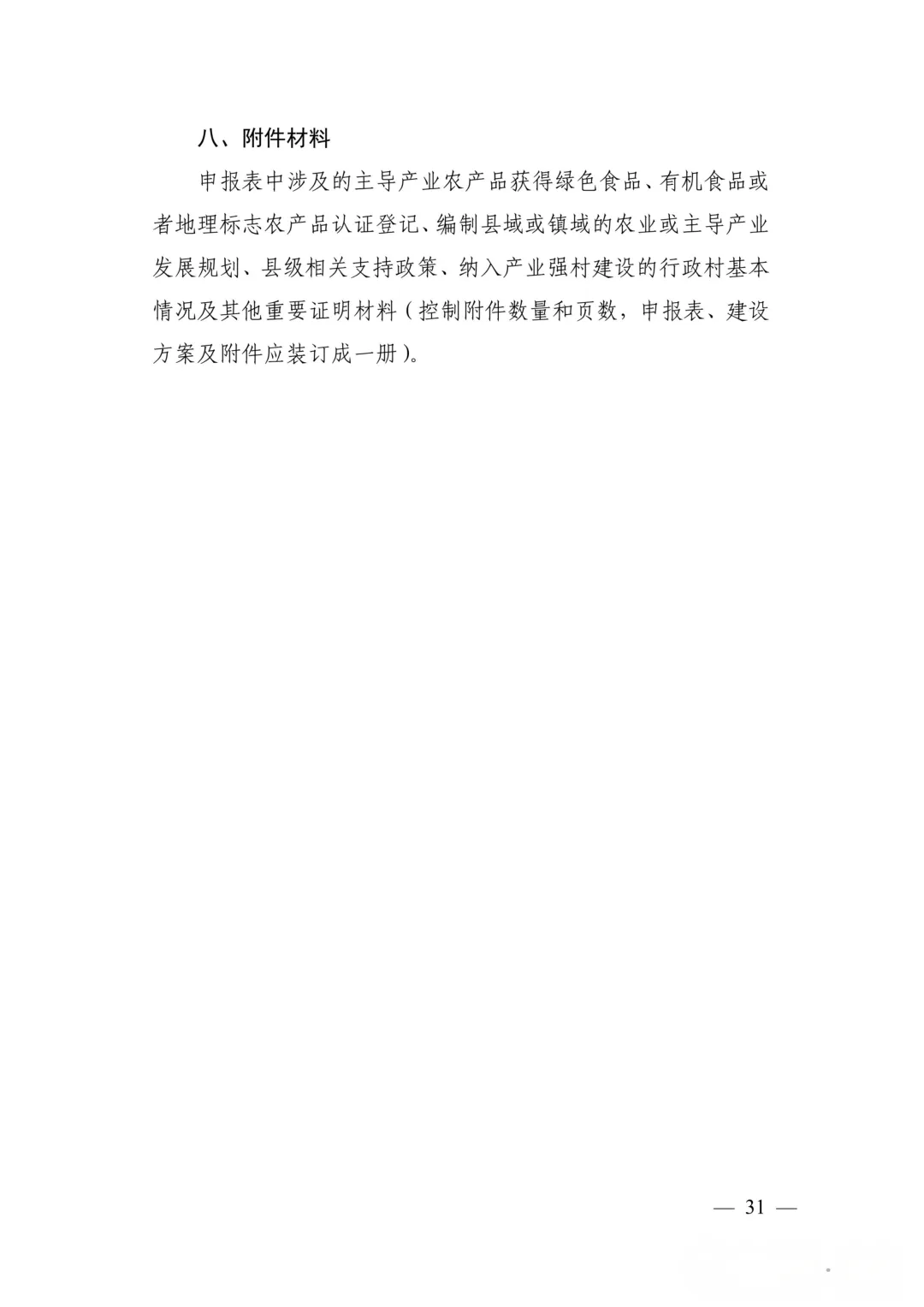 申报材料应包括申报函和现代农业产业园、优势特色产业集群和农业产业强镇分项申报材料。 其中,现代农业产业园分项材料包括产业园建设方案、产业园建设基本情况表等(见附件2) ;优势特色产业集群分项材料包括产业集群建设方案、主导产业基本情况表、项目建设县 ( 市、区) 基本情况表、资金使用分配表以及2022—2024年批准建设且2026年延续支持的产业集群续建方案等(见附件3) ;农业产业强镇分项材料包括省级推荐名单、建设申报表、建设方案和相关附件证明材料(见附件4) 。