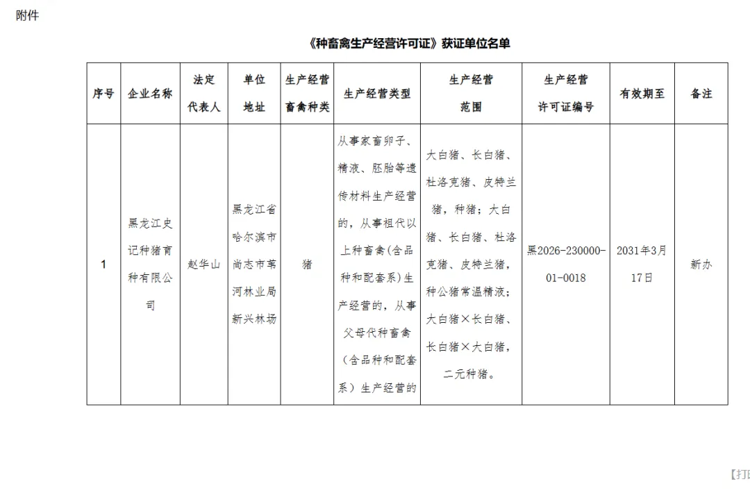 根据《中华人民共和国畜牧法》《种畜禽生产经营许可管理办法》(农业农村部令2025年第1号)、《种畜禽生产经营许可审查规范》(农业农村部公告第964号)等有关规定,经审核,黑龙江史记种猪育种有限公司符合种畜禽生产经营许可证申请条件,批准发放种畜禽生产经营许可证。
