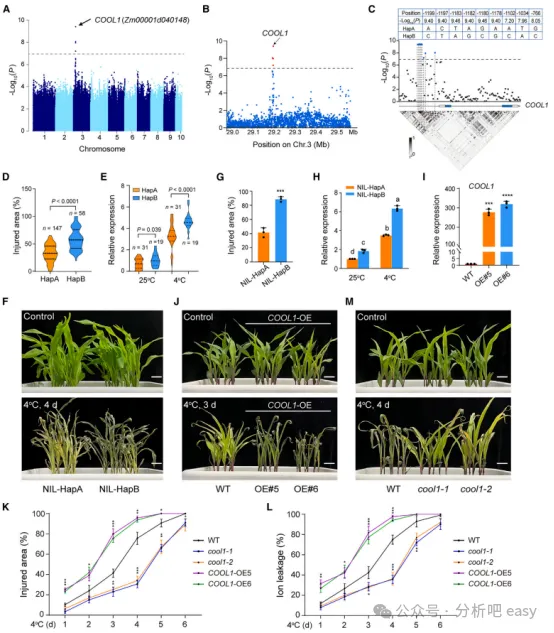 通过对205个自交系玉米品种的表型评估,发现不同遗传资源在4℃低温处理下的叶片损伤程度存在显著差异,其中SS亚群表现出最高的耐冷性。利用全基因组关联分析(GWAS),研究团队在玉米第3号染色体上发现了一个显著峰值,该区域内的五个SNPs与叶片损伤程度显著相关,且均位于bHLH转录因子基因COOL1的启动子区域。进一步的重测序和关联分析揭示了另外四个与耐冷性相关的SNPs,这些SNPs与之前的五个SNPs高度连锁。基于这些SNPs,研究将205个玉米基因型分为耐冷单倍型HapA和冷敏感单倍型HapB,其中HapB基因型的COOL1表达水平较高,表明COOL1表达与耐冷性呈负相关。为验证COOL1的功能,研究构建了携带COOL1HapA等位基因的近等基因系(NIL),并发现NIL-COOL1HapA植株的耐冷性显著增强。此外,通过CRISPR-Cas9基因编辑技术构建的COOL1敲除突变体也表现出更高的耐冷性,而COOL1过表达植株则表现出耐冷性下降。这些结果表明,COOL1在玉米幼苗期耐冷性中起负调控作用。然而,COOL1对种子萌发阶段的耐冷性没有显著影响。综上所述,COOL1通过调控其表达水平影响玉米幼苗的耐冷性,为玉米耐冷育种提供了重要的遗传资源。