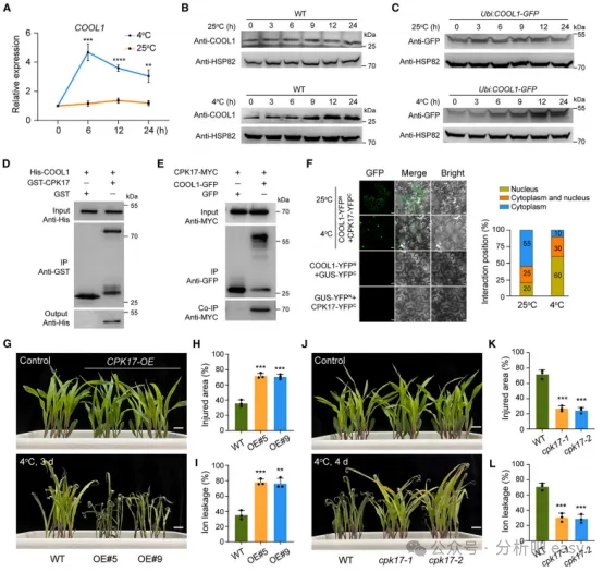 进一步试验结果表明,CPK17通过磷酸化COOL1的Thr-124位点,阻止其被26S蛋白酶体降解。在玉米原生质体中,CPK17的表达量与COOL1蛋白水平呈正相关,而COOL1T124A突变体蛋白稳定性显著降低。冷处理后,CPK17过表达植株中COOL1蛋白水平显著升高,而cpk17突变体中COOL1蛋白水平降低,进一步证实CPK17通过磷酸化增强COOL1稳定性。