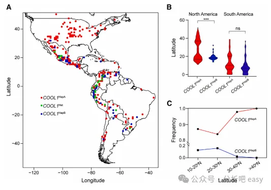 研究发现,耐冷单倍型COOL1HapA在玉米野生近缘种大刍草中已存在,约60%的parviglumis和47%的mexicana携带该等位基因。对1008份美洲玉米地方品种的基因型分析显示,COOL1HapA在高纬度地区(如美国)频率较高,而冷敏感单倍型COOL1HapB主要分布在低纬度地区,表明COOL1可能在玉米适应北方高纬度环境中发挥了重要作用。