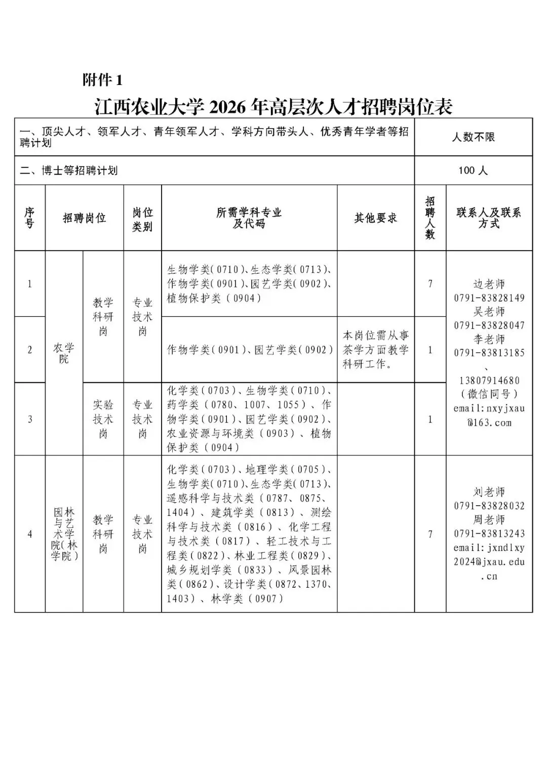 顶尖人才、领军人才、青年领军人才、学科方向带头人、优秀青年学者等招聘人数不限;博士招聘计划共100名。具体招聘岗位及要求详见《江西农业大学2026年高层次人才招聘岗位表》(附件1,以下简称《岗位表》)。