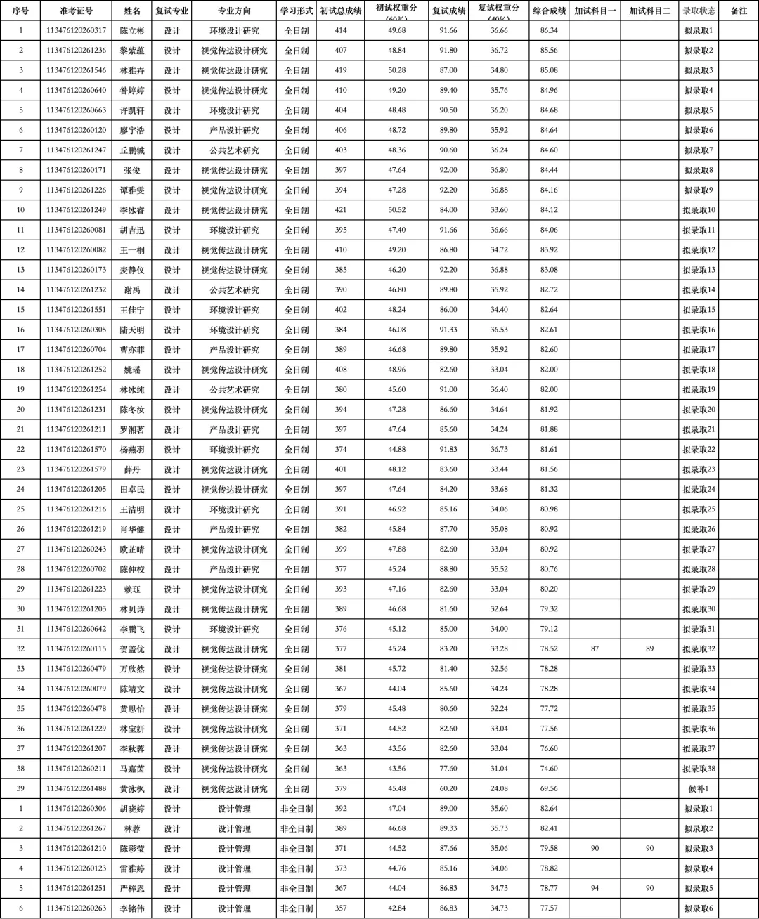 根据《仲恺农业工程学院2026年硕士研究生招生复试录取办法》和《仲恺农业工程学院何香凝艺术设计学院2026年硕士研究生招生复试工作细则》,我院对一志愿考生进行了复试,现将复试结果进行公示。