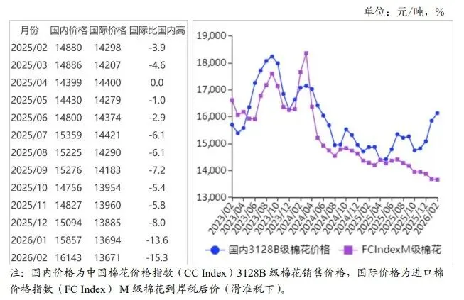 2 月份,国内 3128B 级棉花月均价每吨16143元,环比涨 1.8%,同比涨 8.5%。郑棉期货主力合约CF605月结算价每吨 15330 元,环比涨 3.9%,同比涨10.7%。