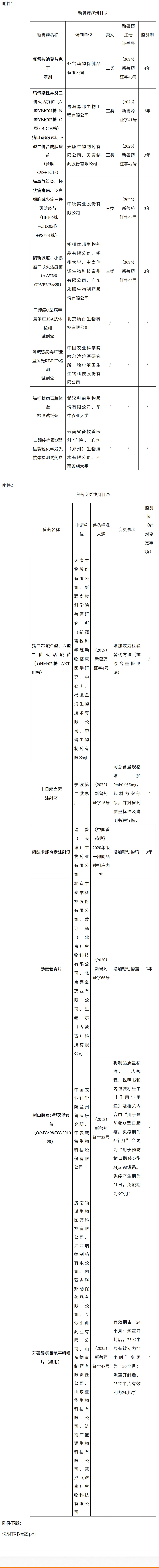 批准猪口蹄疫O型、A型二价灭活疫苗(OHM/02株+AKT-III株)变更注册,发布修订后的质量标准、工艺规程、说明书和标签,自发布之日起执行,此前发布的产品质量标准、工艺规程、说明书和标签同时废止;批准卡贝缩宫素注射液变更注册,发布修订后的质量标准、说明书和标签,自发布之日起执行,此前发布的产品质量标准、说明书和标签同时废止;批准硫酸卡那霉素注射液、参麦健胃片变更注册,发布修订后的说明书和标签,自发布之日起执行,此前发布的产品说明书和标签同时废止;批准猪口蹄疫O型灭活疫苗(O/MYA98/BY/2010株)、苯磺酸氨氯地平咀嚼片(猫用)变更注册,有关单位按照农业农村部批准的变更事项,自行修改原批准的质量标准、工艺规程、说明书和标签对应内容,并印制、使用。