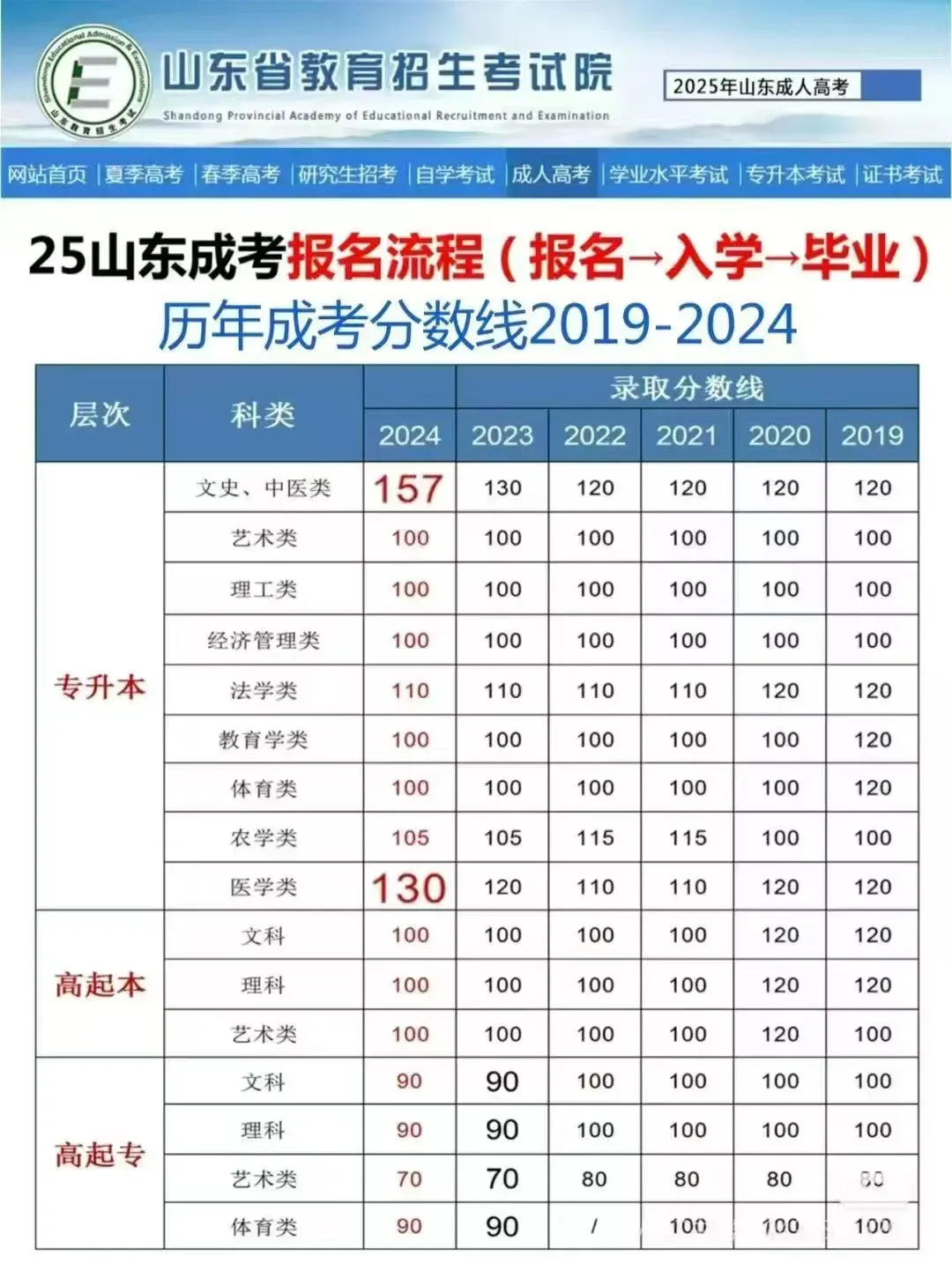 山东成人高考历年分数线