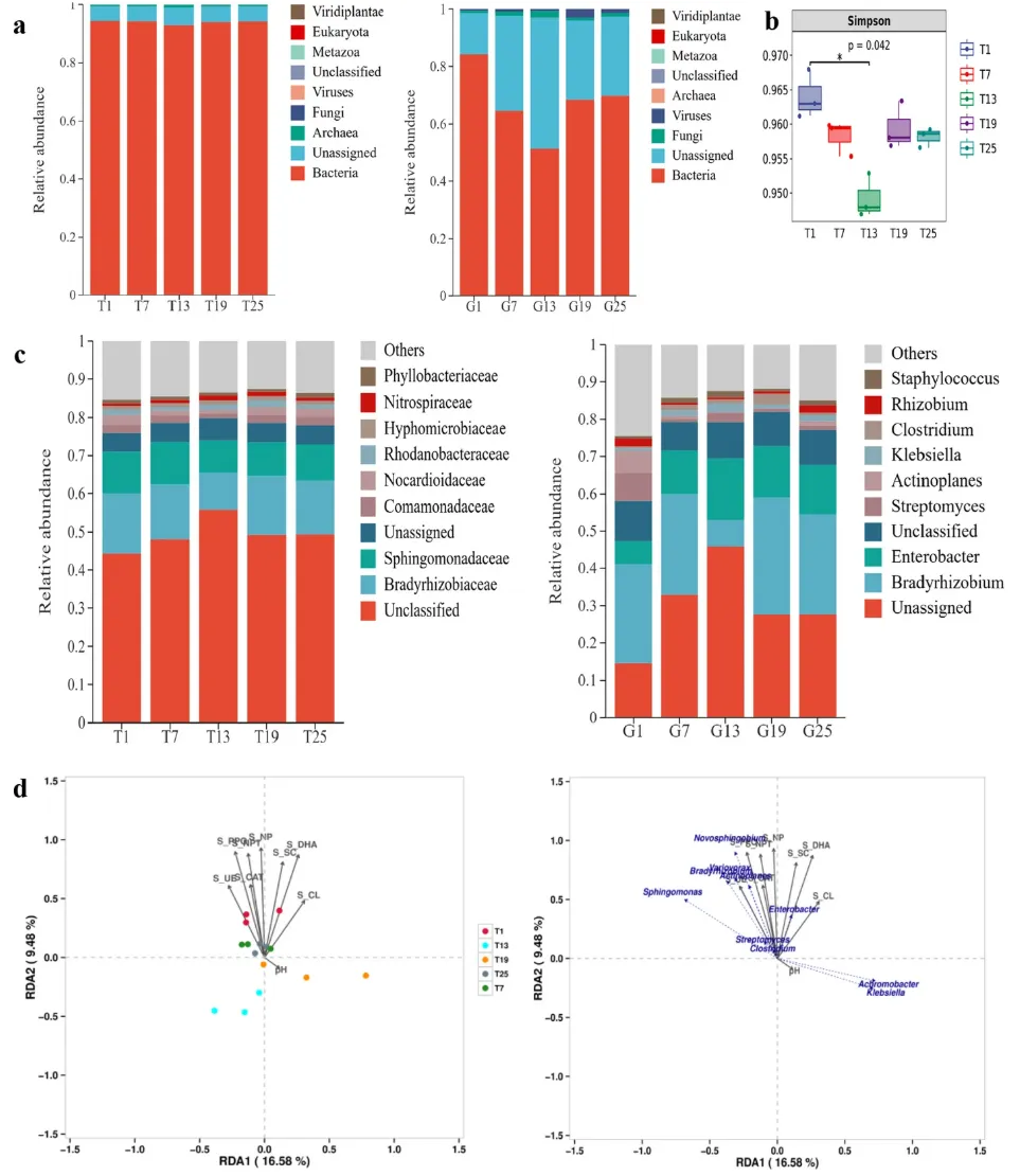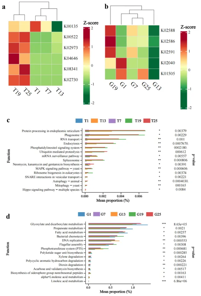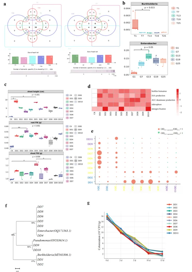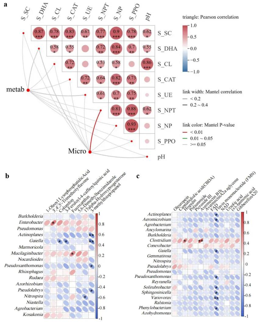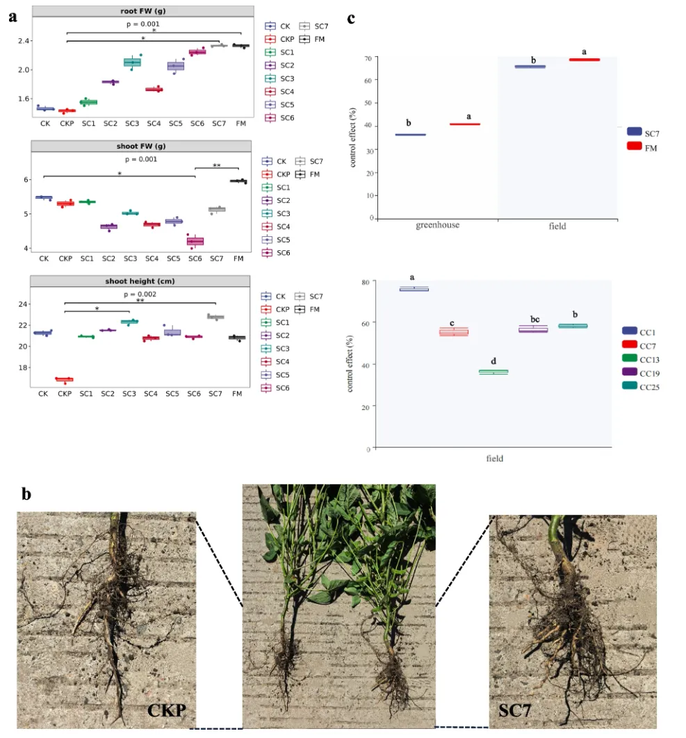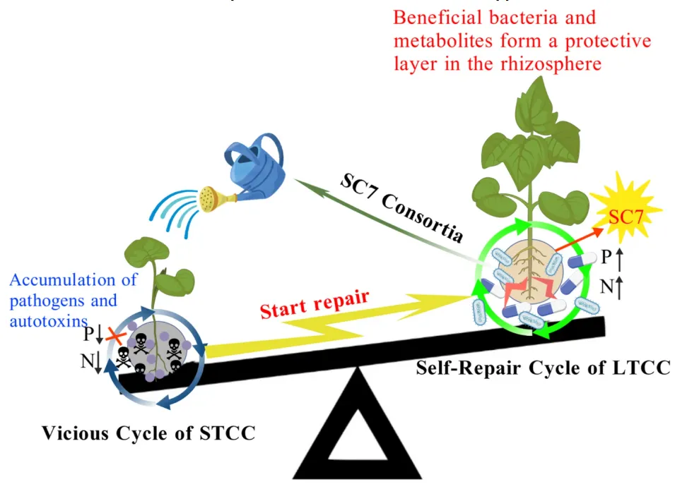 Results 结果显示,长期覆盖栽培(LTCC)使化感自毒物质的积累减少49.06%(P < 0.05),并富集了有益的根际代谢物(如抗生素类、单萜类及苷类化合物),驱动微生物群落向具有病原抑制和养分循环功能的类群演替。LTCC培育的微生物组中,与抗逆性和养分吸收相关的基因得到强化。相比之下,短期覆盖栽培(STCC)加剧了连作障碍(CCO)胁迫,微生物失调在13年时达到峰值(辛普森指数下降15.4%)。值得注意的是,持续25年的LTCC恢复了生态系统稳定性与酶活性,重构了具有病原抑制和养分循环功能的微生物群落结构。通过重新引入包括假单胞菌属(Pseudomonas)、伯克霍尔德菌属(Burkholderia)和肠杆菌属(Enterobacter)在内的耗竭菌种,我们构建了一个合成菌群SC7。该合成菌群提升了土壤酶活性和根瘤数量,增强了植物抵御胁迫的能力,使产量增加4.83%,模拟了长期覆盖栽培系统的优势效应。