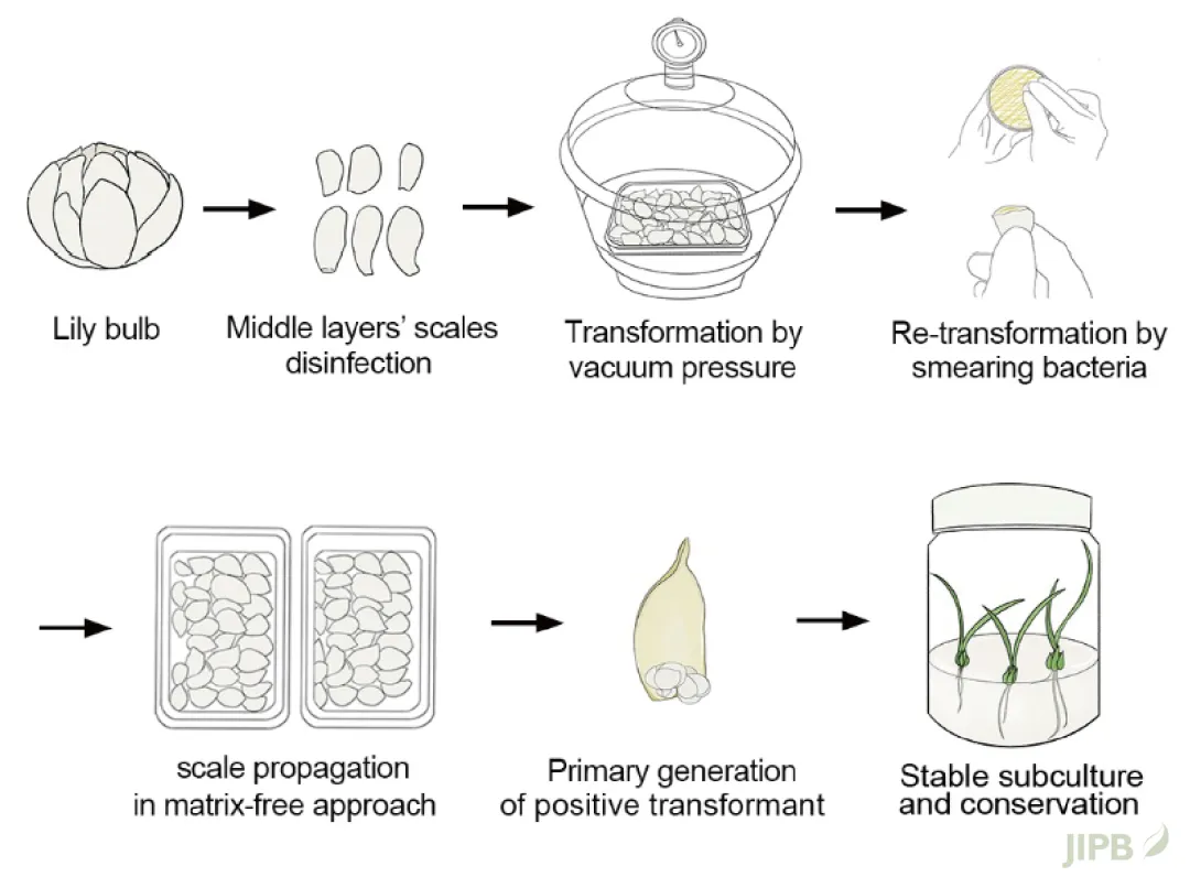 研究团队利用百合鳞片扦插可在1–2个月内再生小鳞茎的特点, 通过优化农杆菌菌株C58C1, 添加促再生激素IAA及改进消毒方法, 实现了在40天内获得转基因阳性苗 (P1代), 2–3个月内获得稳定遗传的转基因后代 (P2代)。
