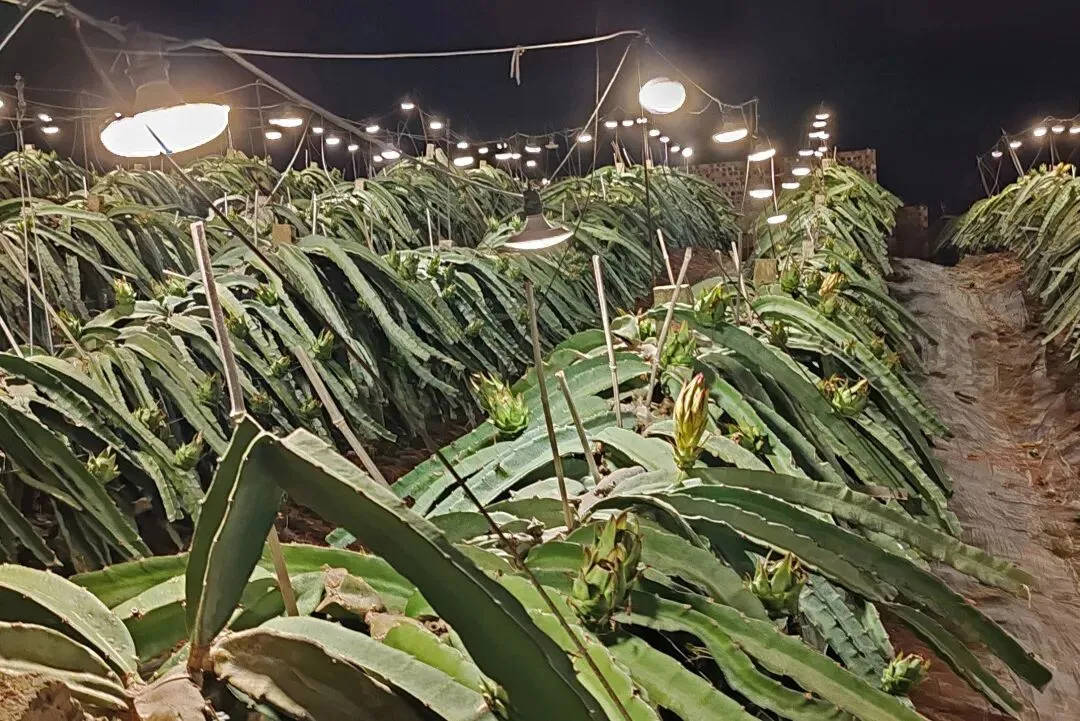 其次,目前的火龙果生产中更倾向使用间隔性补光的方式补光。其不仅省能耗、省钱,还有利于火龙果生长。至于具体是间隔几个小时补一次光,每个种植区都有自己的方案。