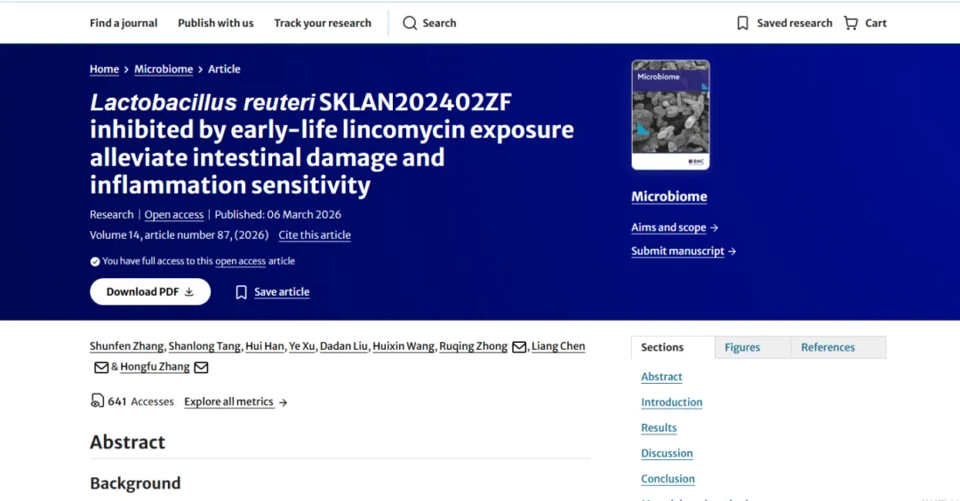 近日,中国农业科学院北京畜牧兽医研究所、畜禽营养与饲养全国重点实验室家畜营养与调控科技创新团队揭示了生命早期接触林可霉素加剧机体炎症易感性,以及补充罗伊氏乳杆菌SKLAN20240 2ZF有效减轻肠道炎症和屏障损伤的相关机制。相关研究成果Lactobacillus reuteri SKLAN202402ZF inhibited by early-life lincomycin exposure alleviate intestinal damage and inflammation sensitivity发表在《微生物组(Microbiome)》上。