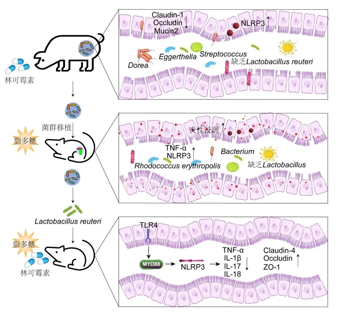 研究人员将对照组和林可霉素组仔猪的粪便菌群分别移植到小鼠体内,当小鼠遭遇脂多糖攻击时,接受林可霉素暴露菌群的小鼠表现出更严重的炎症反应和更显著的体重下降,其结肠中乳杆菌属的丰度降低,表明抗生素诱导的菌群失调会导致宿主对后续炎症更敏感。接下来,让小鼠先暴露于林可霉素,随后补充罗伊氏乳杆菌,再用脂多糖进行攻击。结果显示,补充罗伊氏乳杆菌的小鼠肠道屏障损伤和炎症细胞浸润程度都显著轻于抗生素暴露组。机制分析表明,罗伊氏乳杆菌通过抑制TLR4/MyD88通路的激活,进而下调NLRP3炎症小体的活化,从而抑制脂多糖诱导的肠道炎症。